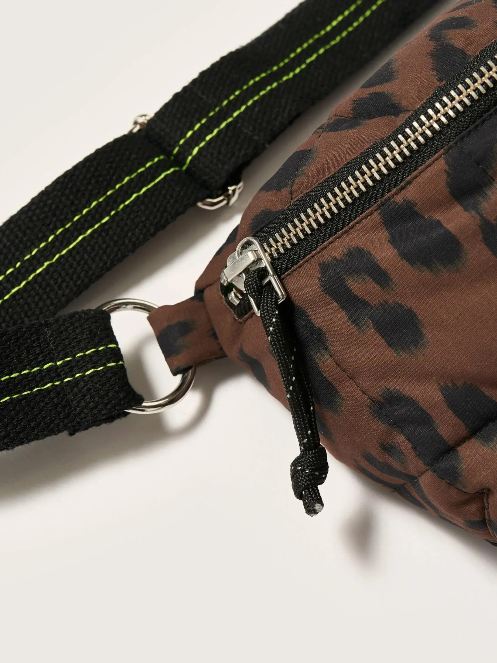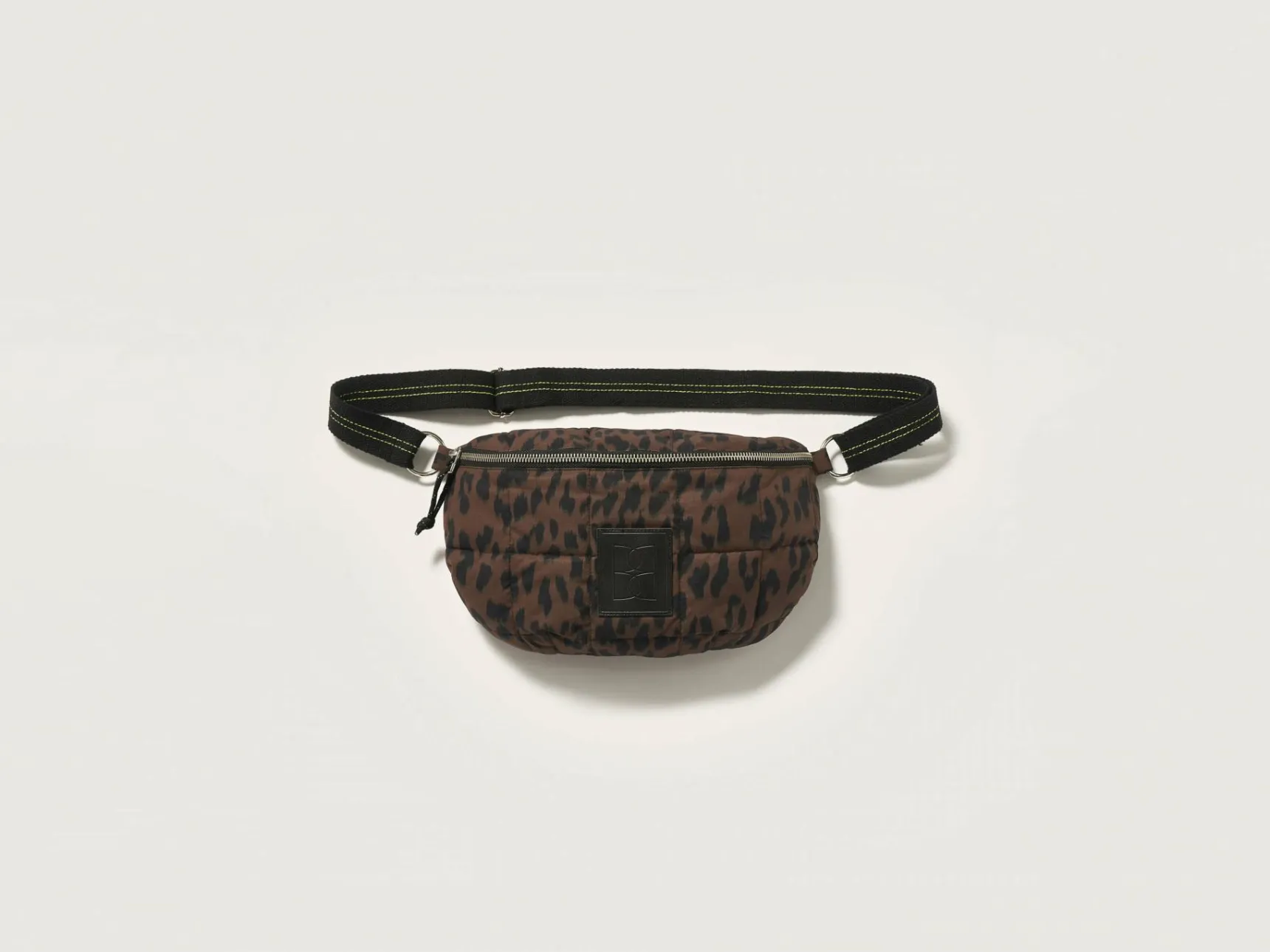 Heuptas met rits vooraan, van gewatteerde ripstop met luipaardprint.