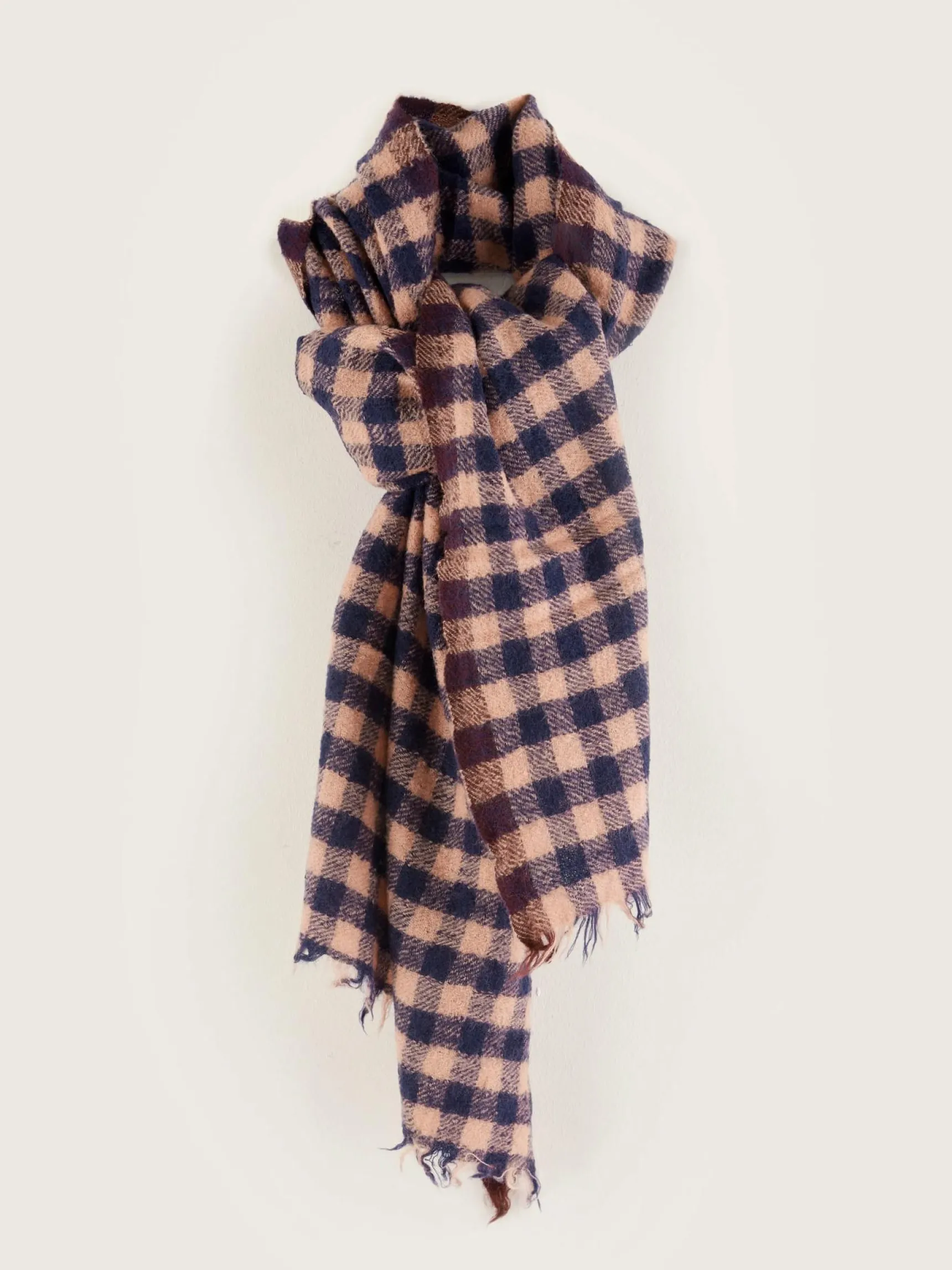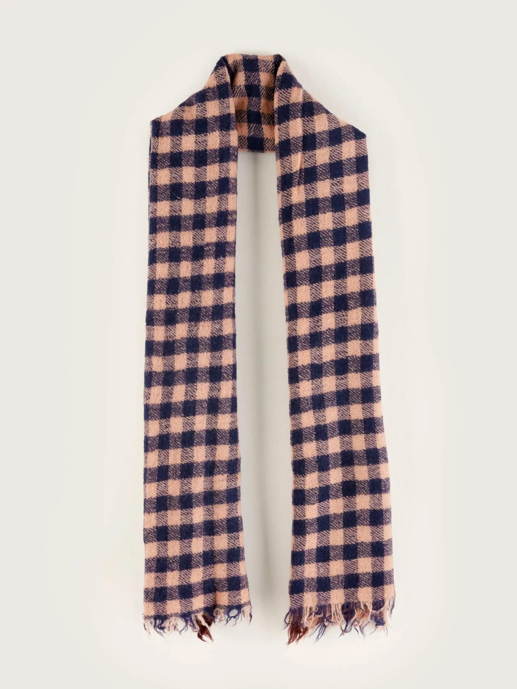 Geweven wollen sjaal met roze ruitjespatroon.
