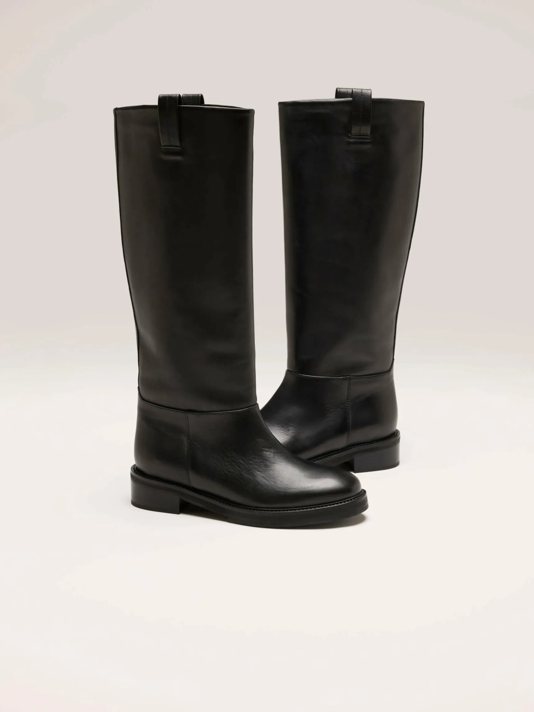 De Flattered Frances leren kuitlaars is een tijdloos, strak silhouet van volnerf zwart leer met een lage hak.