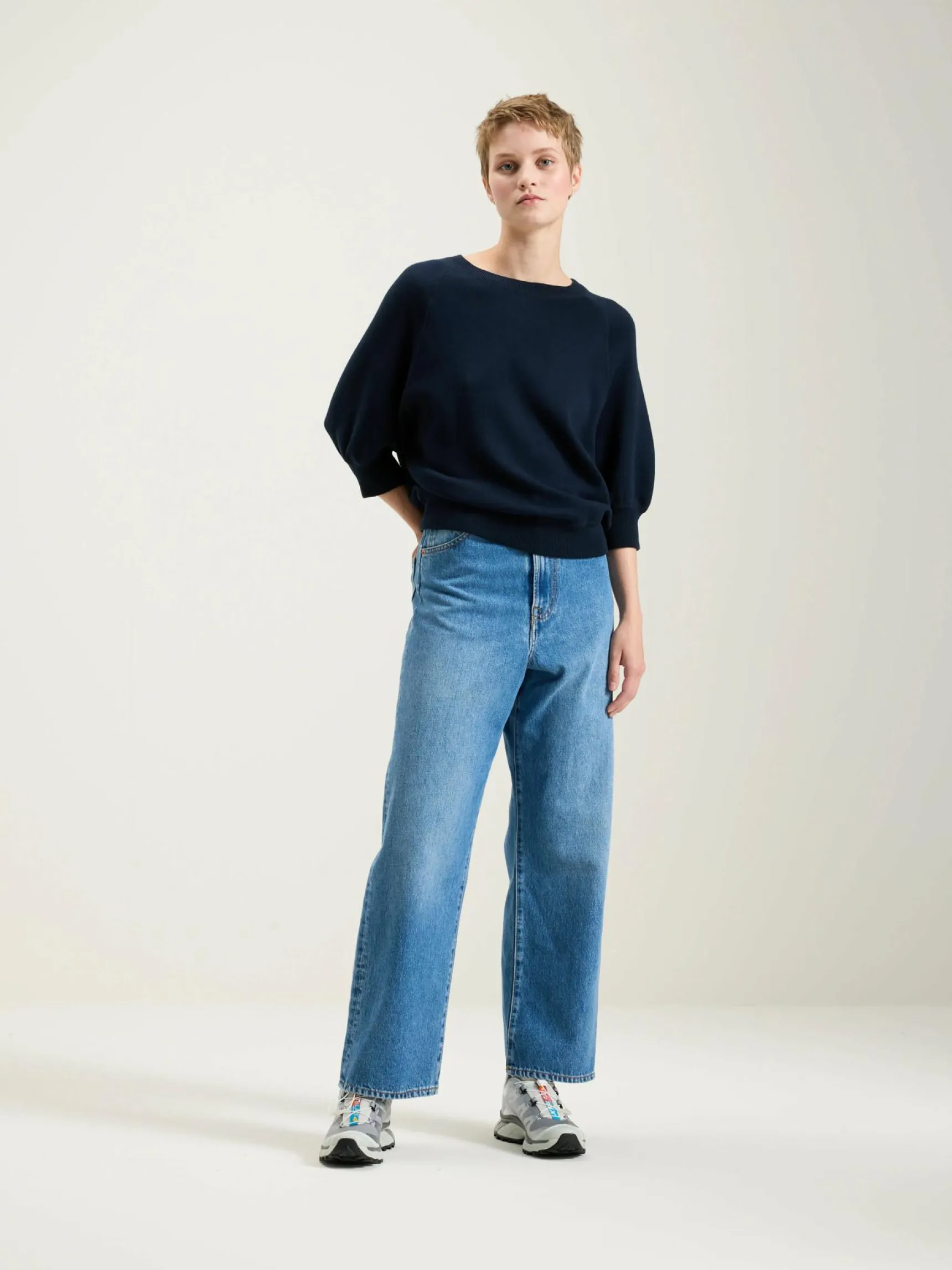 Oversizede crewneck trui met 3/4 mouwen en geribde boorden in marineblauw katoen.
