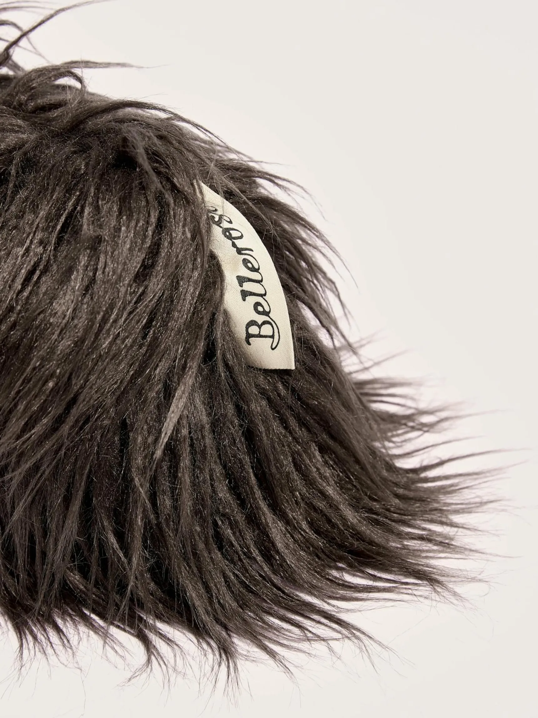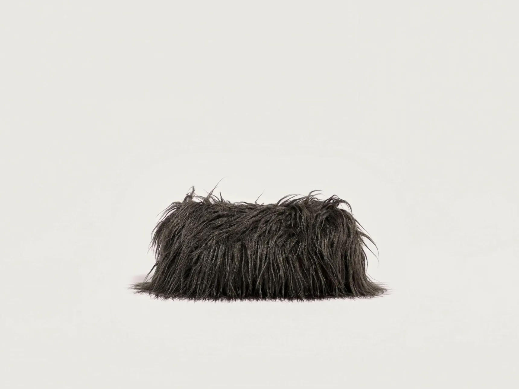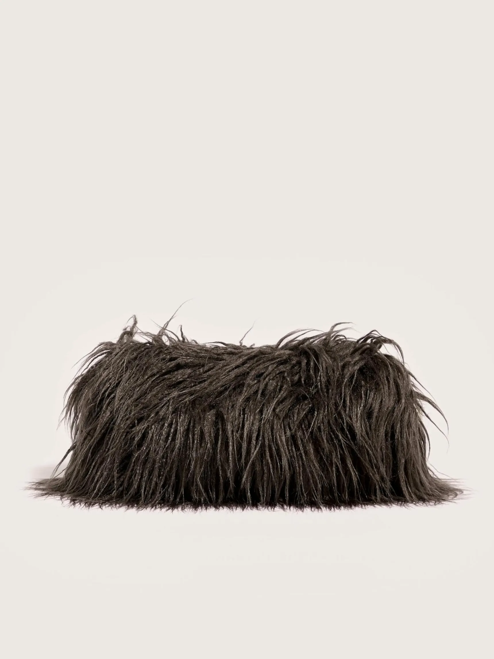 Clutch bag van nepbont dat een imitatie is van Mongoolse lamswol, gevoerd met gewatteerde paarse stof.