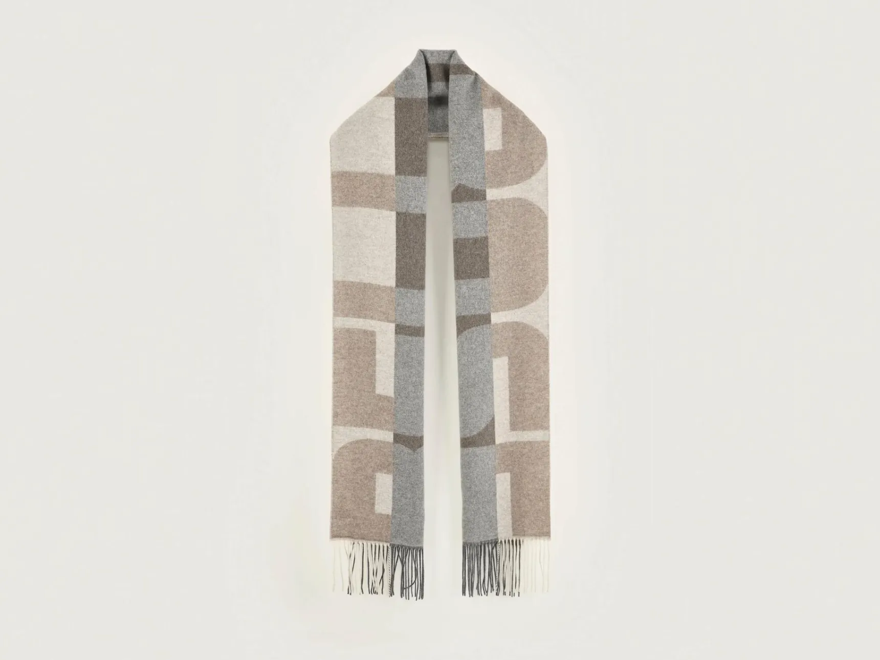 Geweven sjaal in neutrale tinten, met reusachtig groot logo.