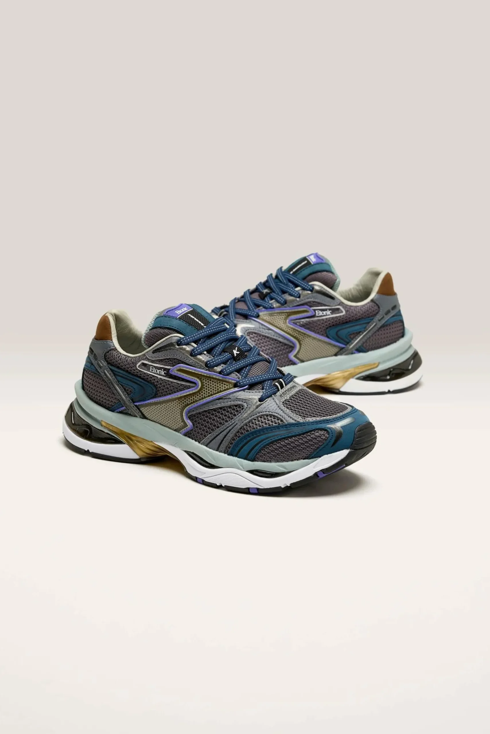 The Etonic Kendari Multi running sneaker features a technical textile and mesh upper with leather panels, tonal laces, and comfort details.