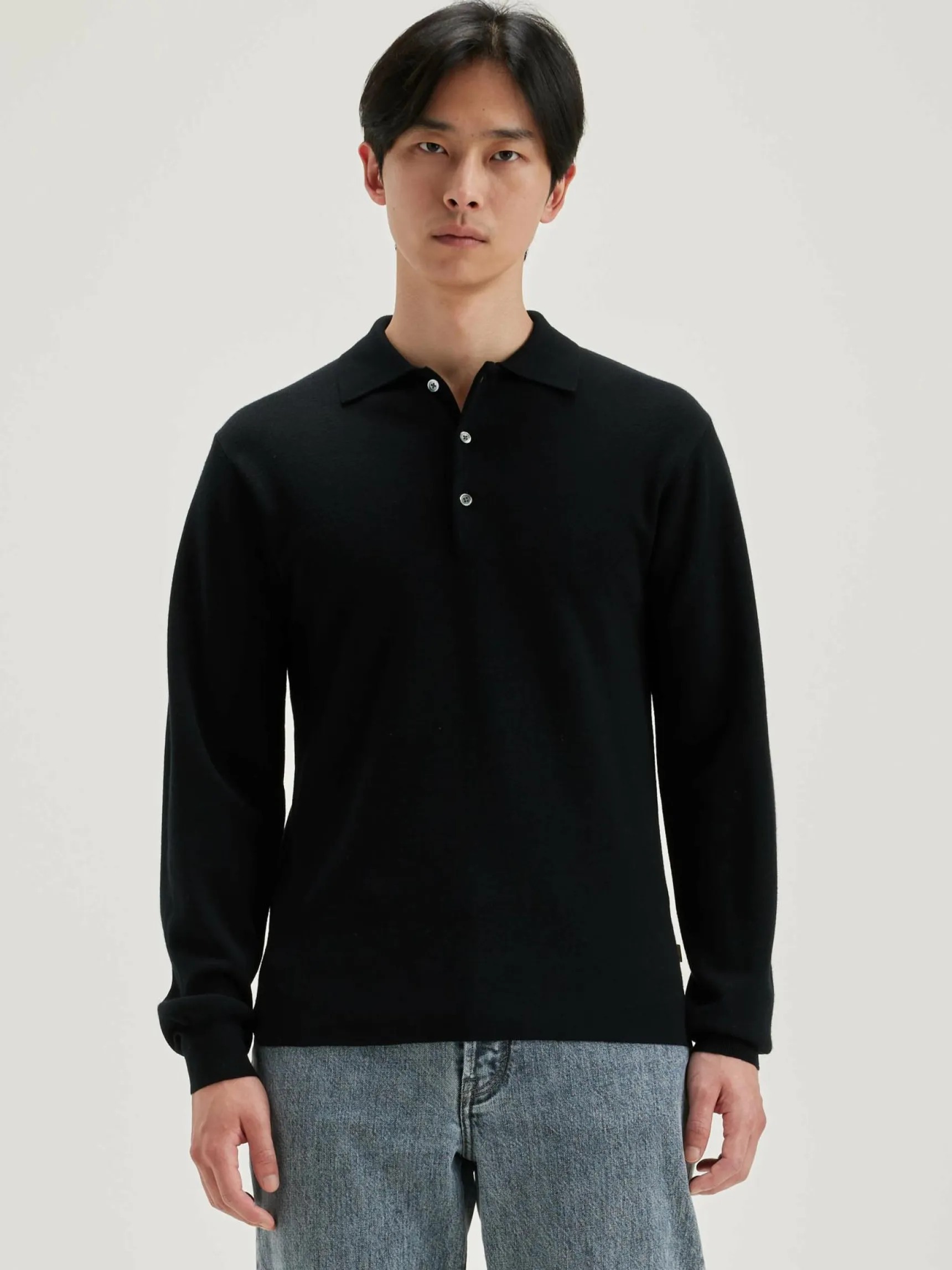 Klassieke, zwartblauwe sweater in polostijl, van extrafijne merinowol.