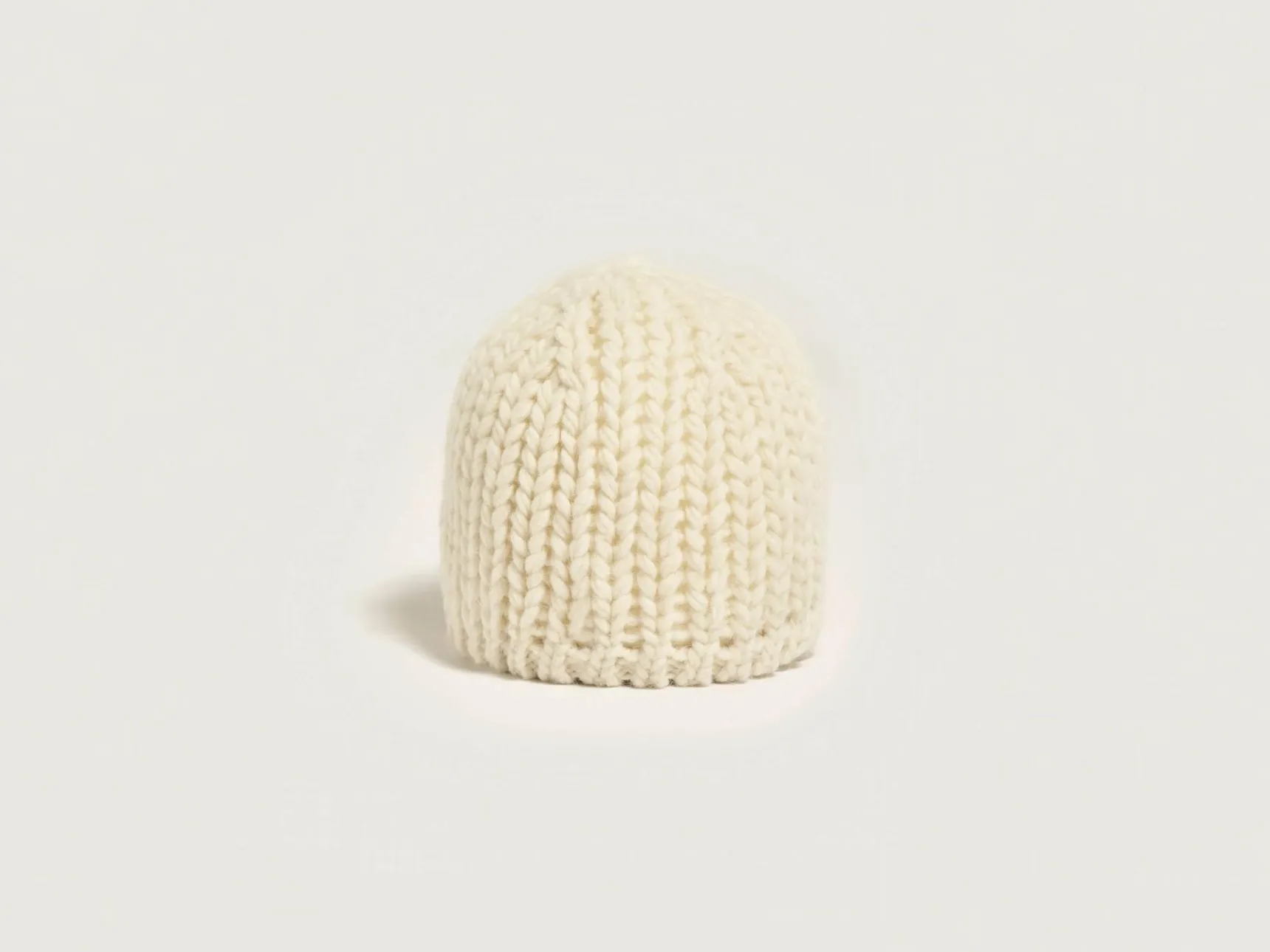 Ivoorwitte, gebreide muts van dik garen, met Bellerose-label op de voorkant.