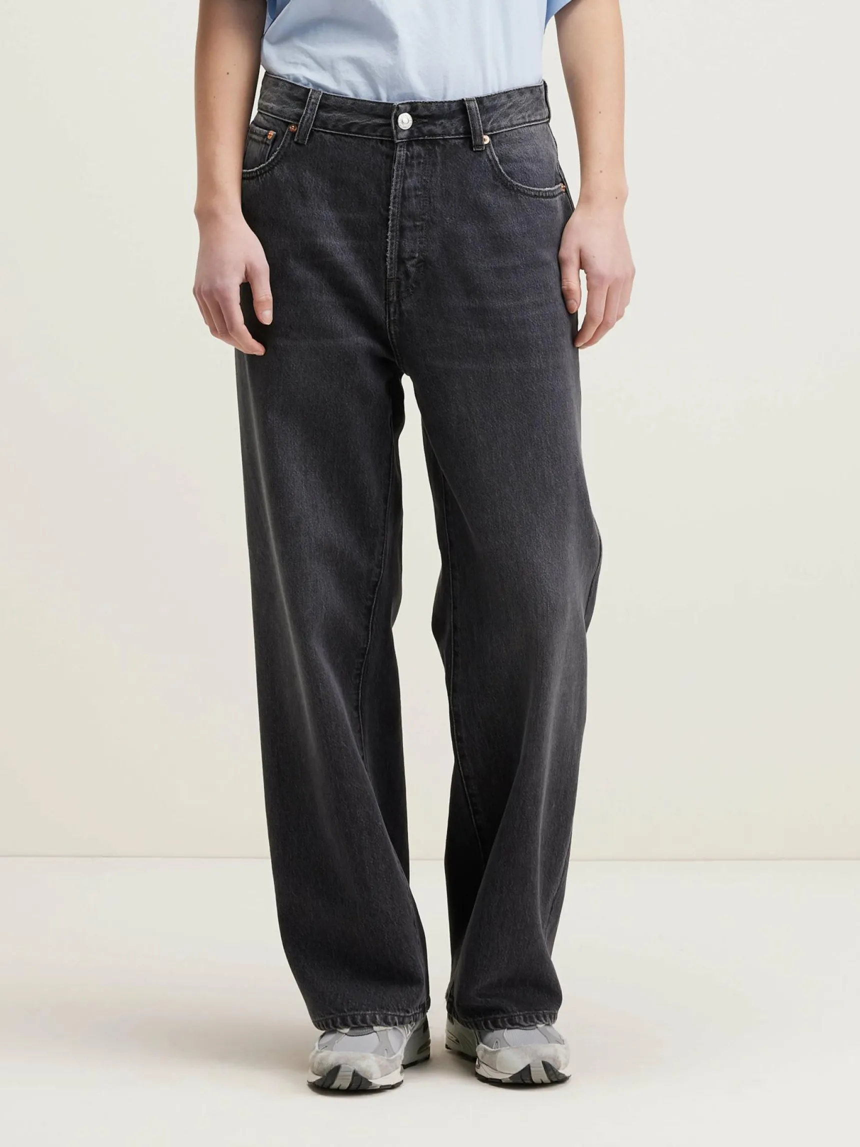 Mid-waist jeans met wijde pijpen in versleten zwart.