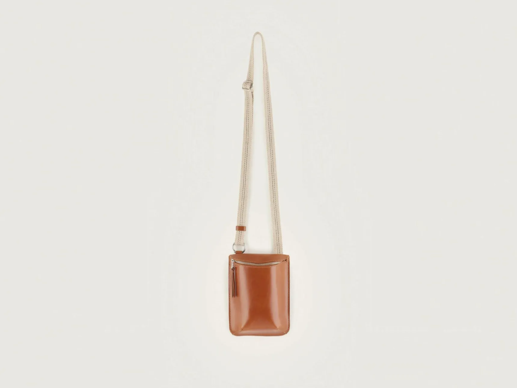 Mini tas met ritssluiting van soepel cognac-kleurig leer met een kenmerkende dubbel gestikte riem.