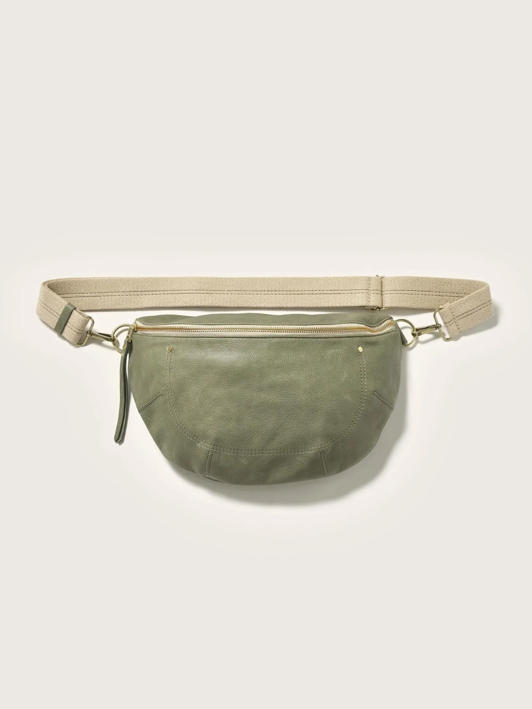 Soepele heuptas van grijsgroen leer.