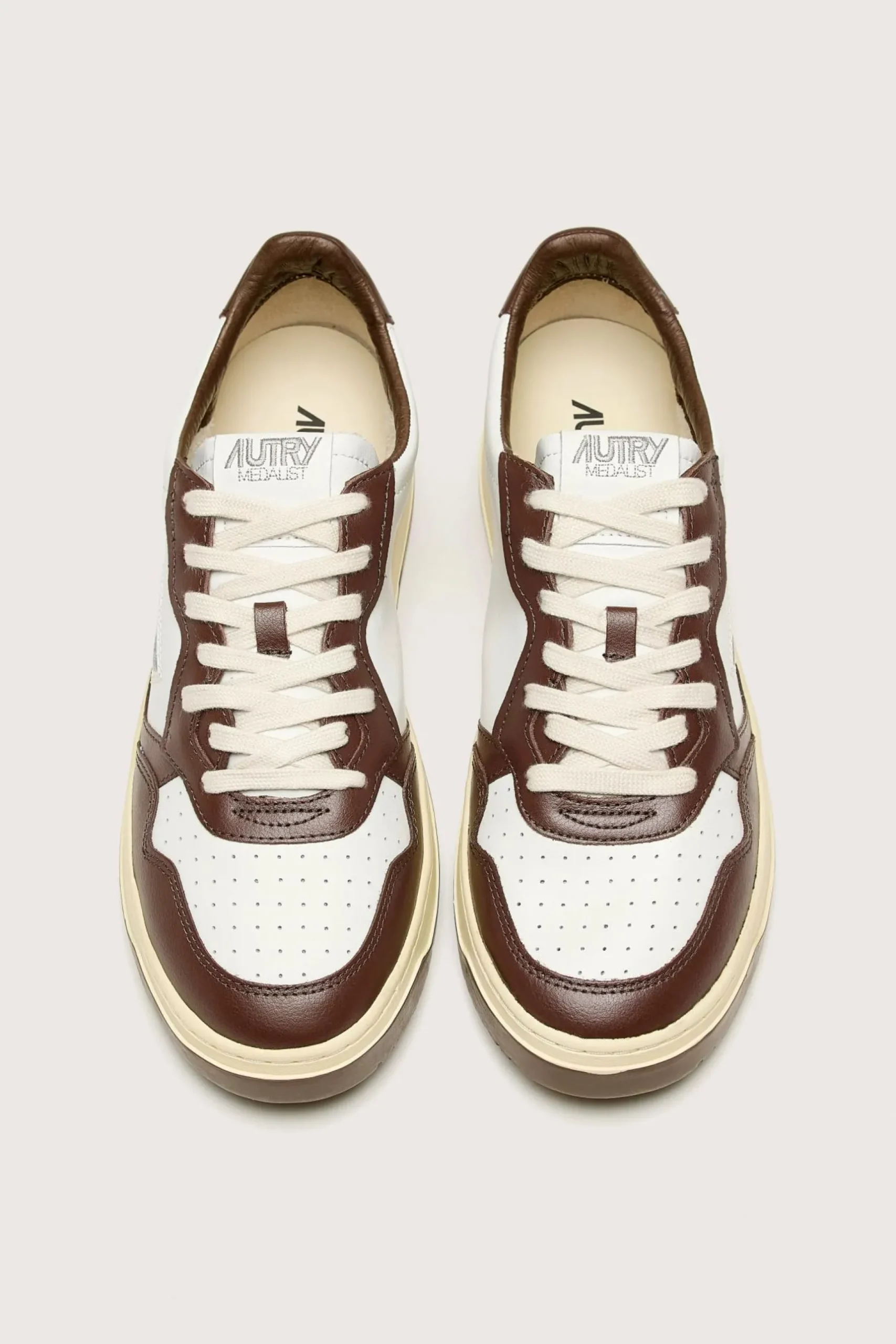 The Autry Medalist Low Bicolor sneaker features a white and chestnut supple leather upper with a perforated toe and black rubber outsole.