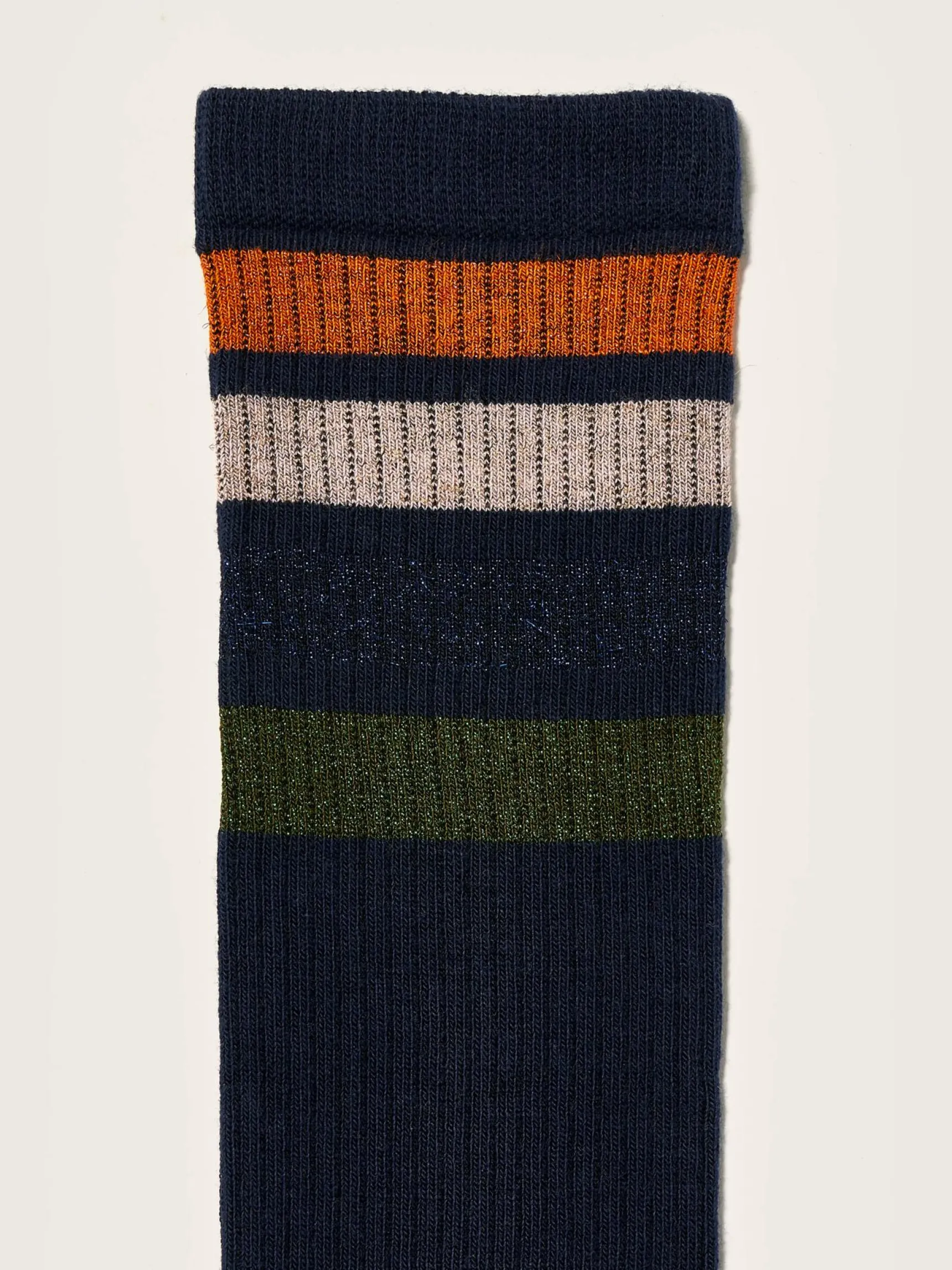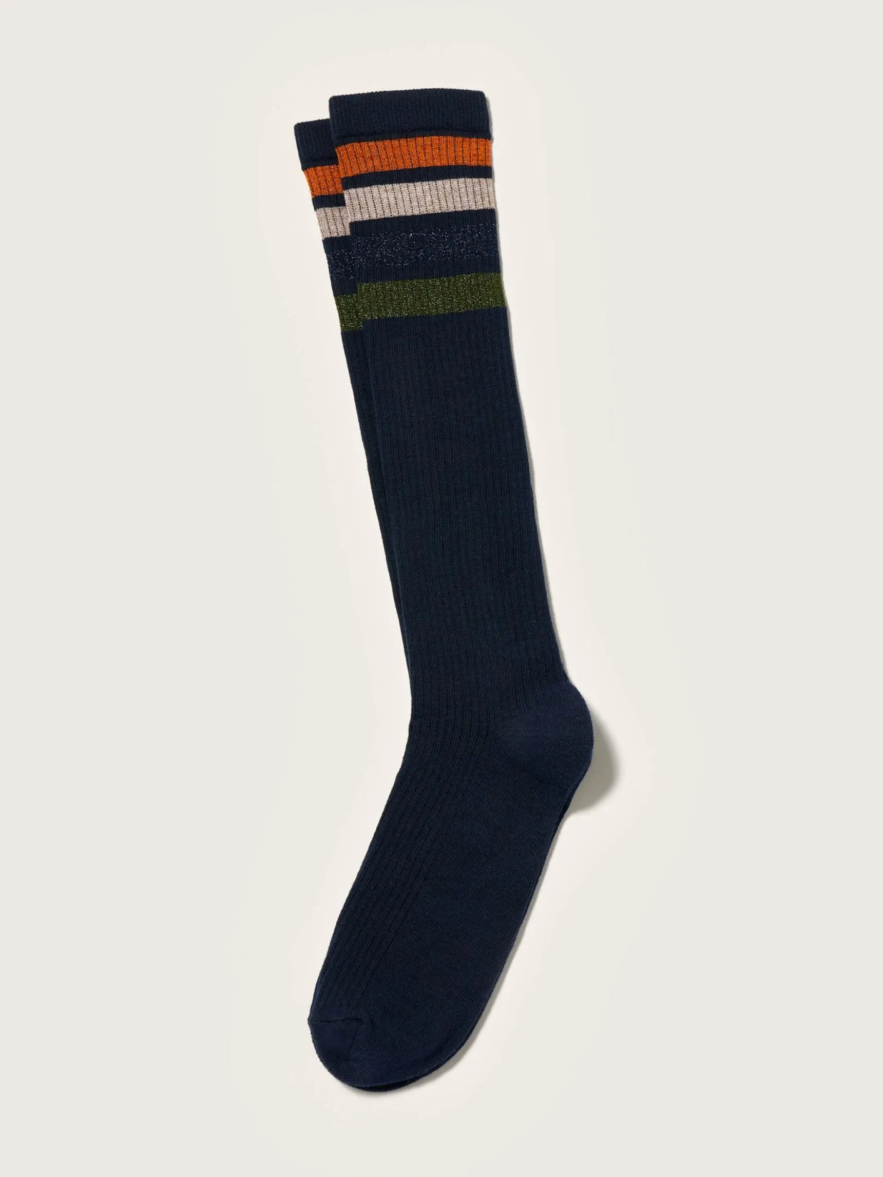 Donkerblauwe kniekousen met lurexstrepen.