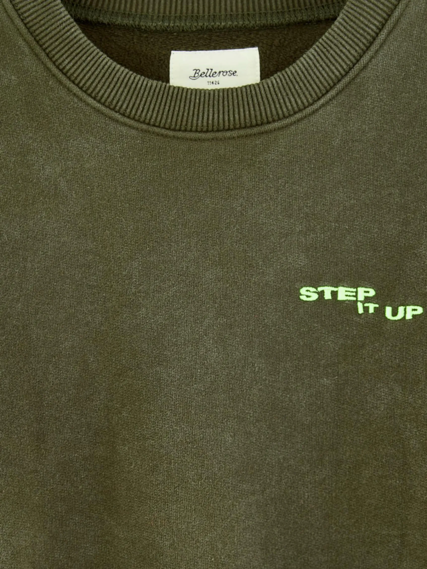 Comfortabel mosgroen sweatshirt van geborstelde fleece en met “Step it up”-print en foto van Daniil Lavrovski.