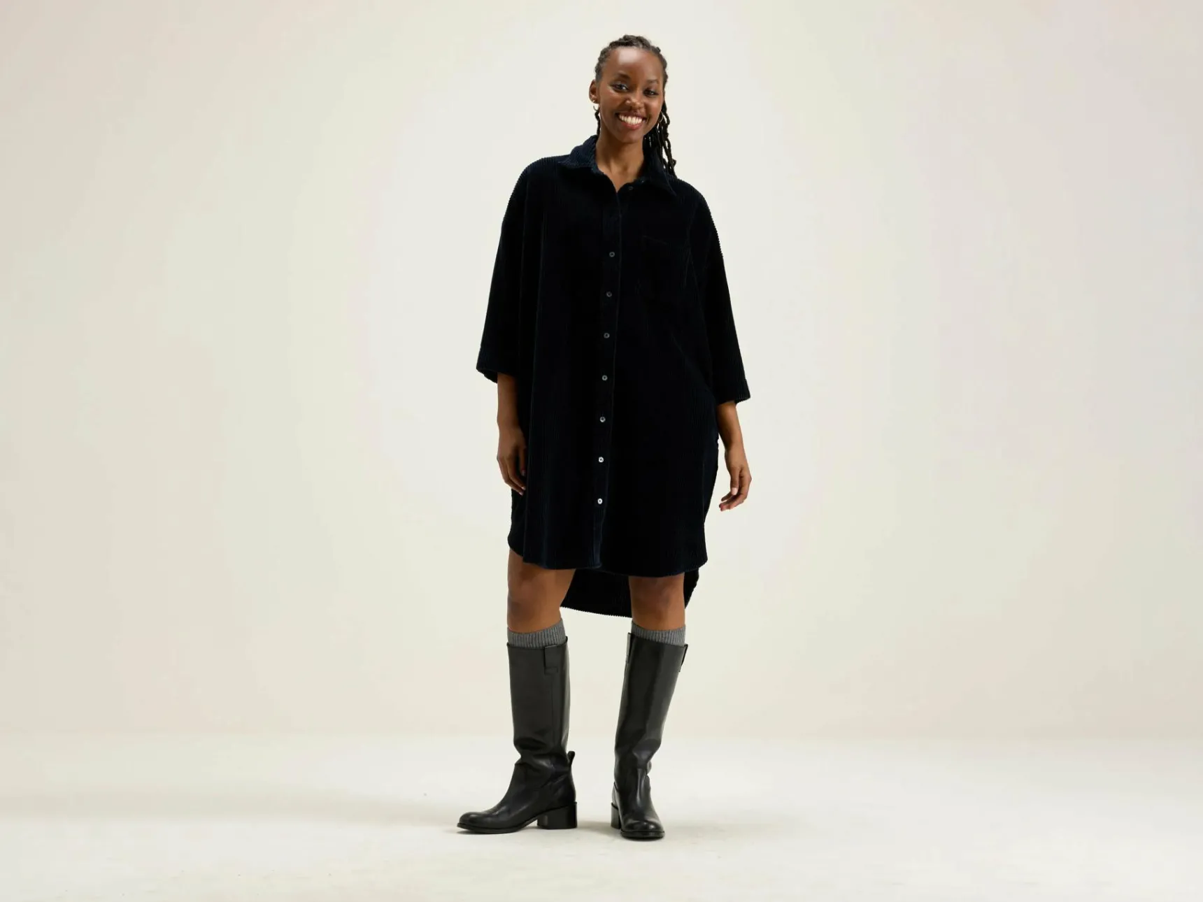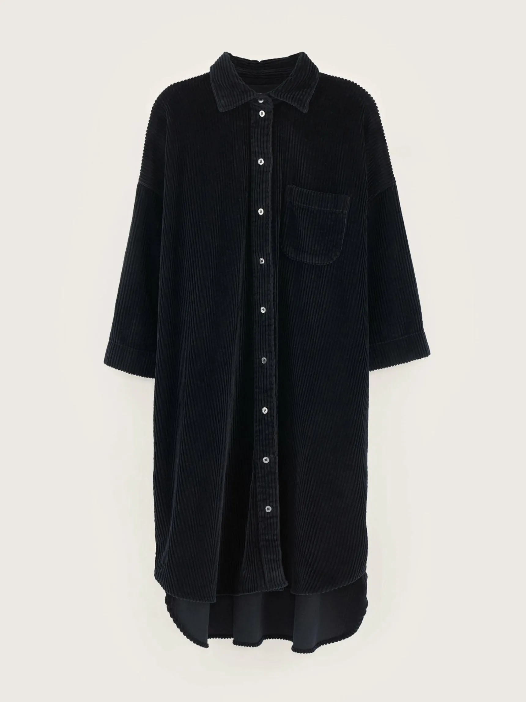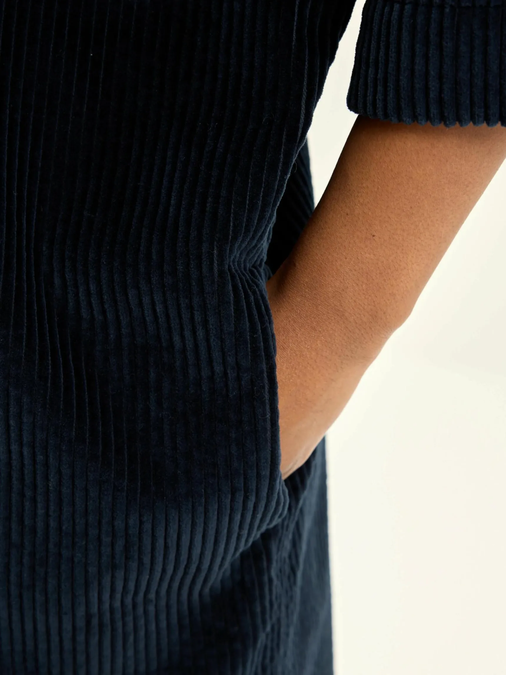Donkerblauwe, oversizede hemdjurk van katoencorduroy met brede rib.