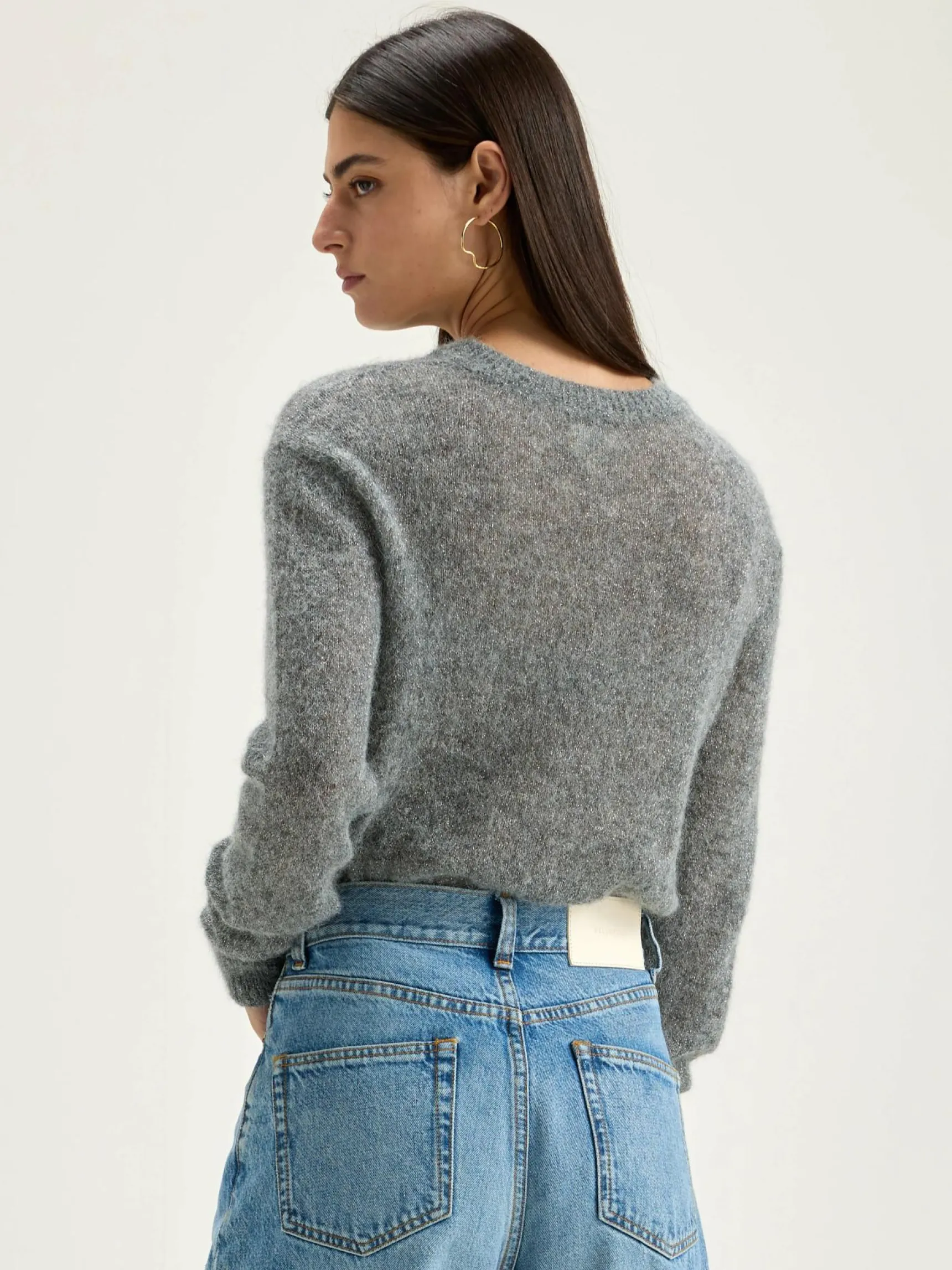 Middengrijze trui met V-hals en een regular model, van garen met lurex en baby alpaca.