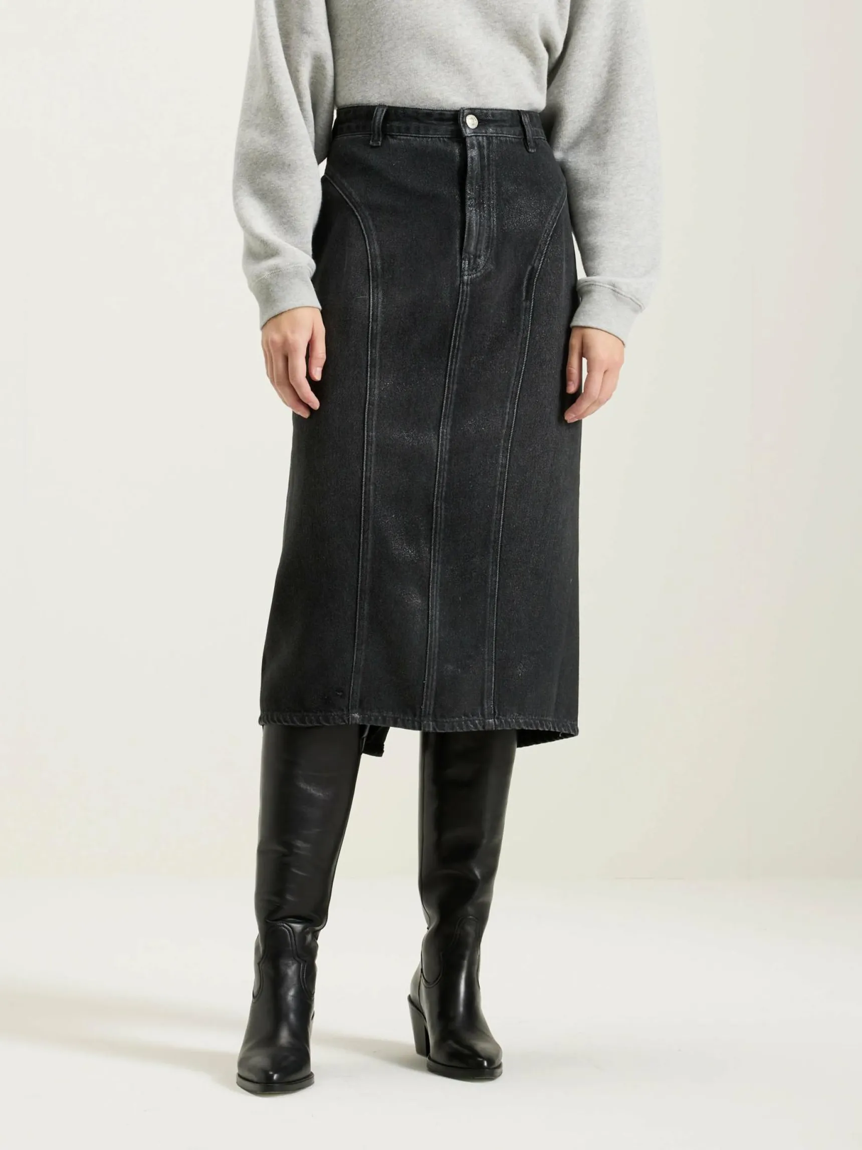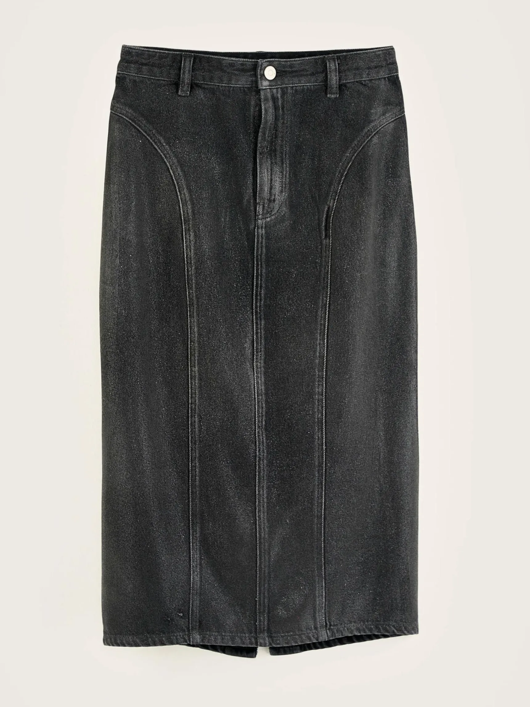 High-waist midikokerrok met gebogen panelen aan de zijkant, gemaakt van licht versleten zwart denim met een glanzend gecoate afwerking.