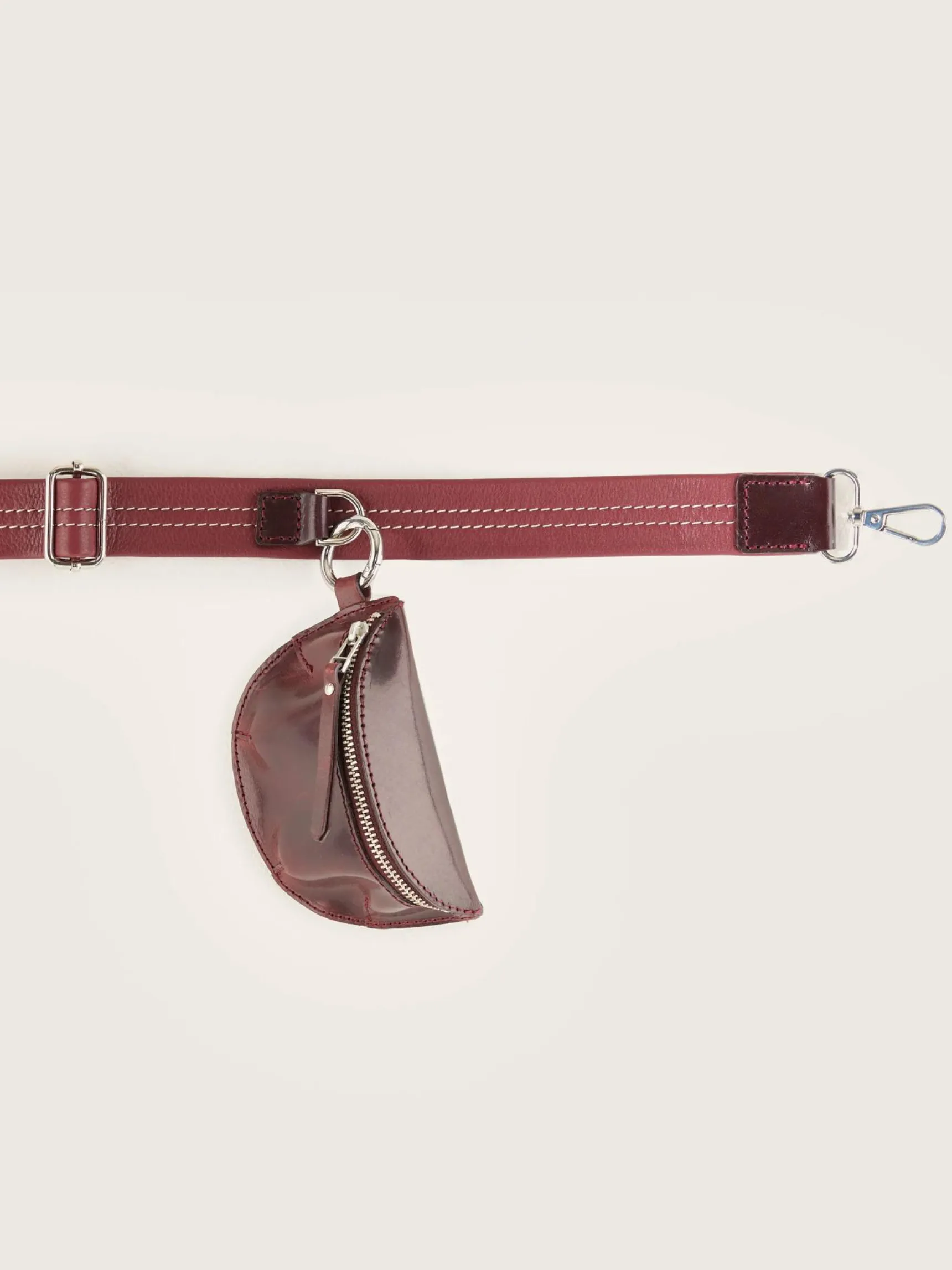 Verstelbare riem van bordeauxrood glad leer met zilverkleurige hardware.