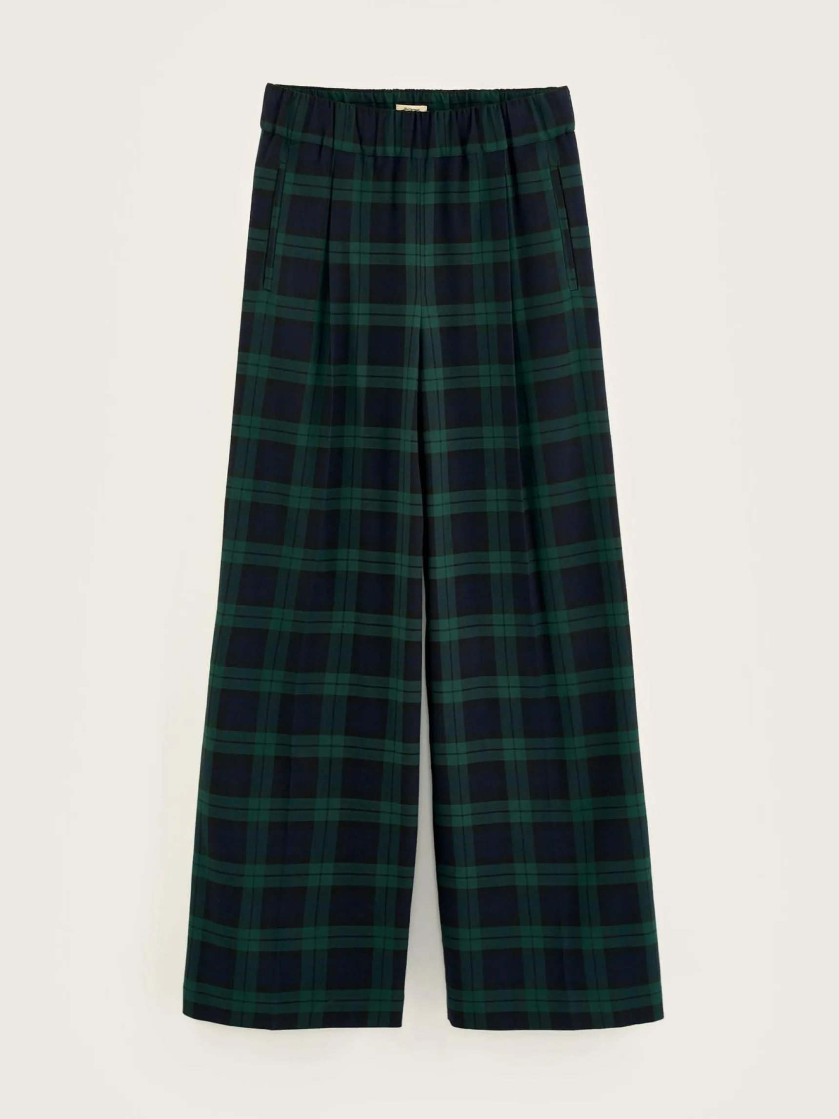 Broek met wijde pijpen, een elastische tailleband en paspelzakken, met black watch ruiten.