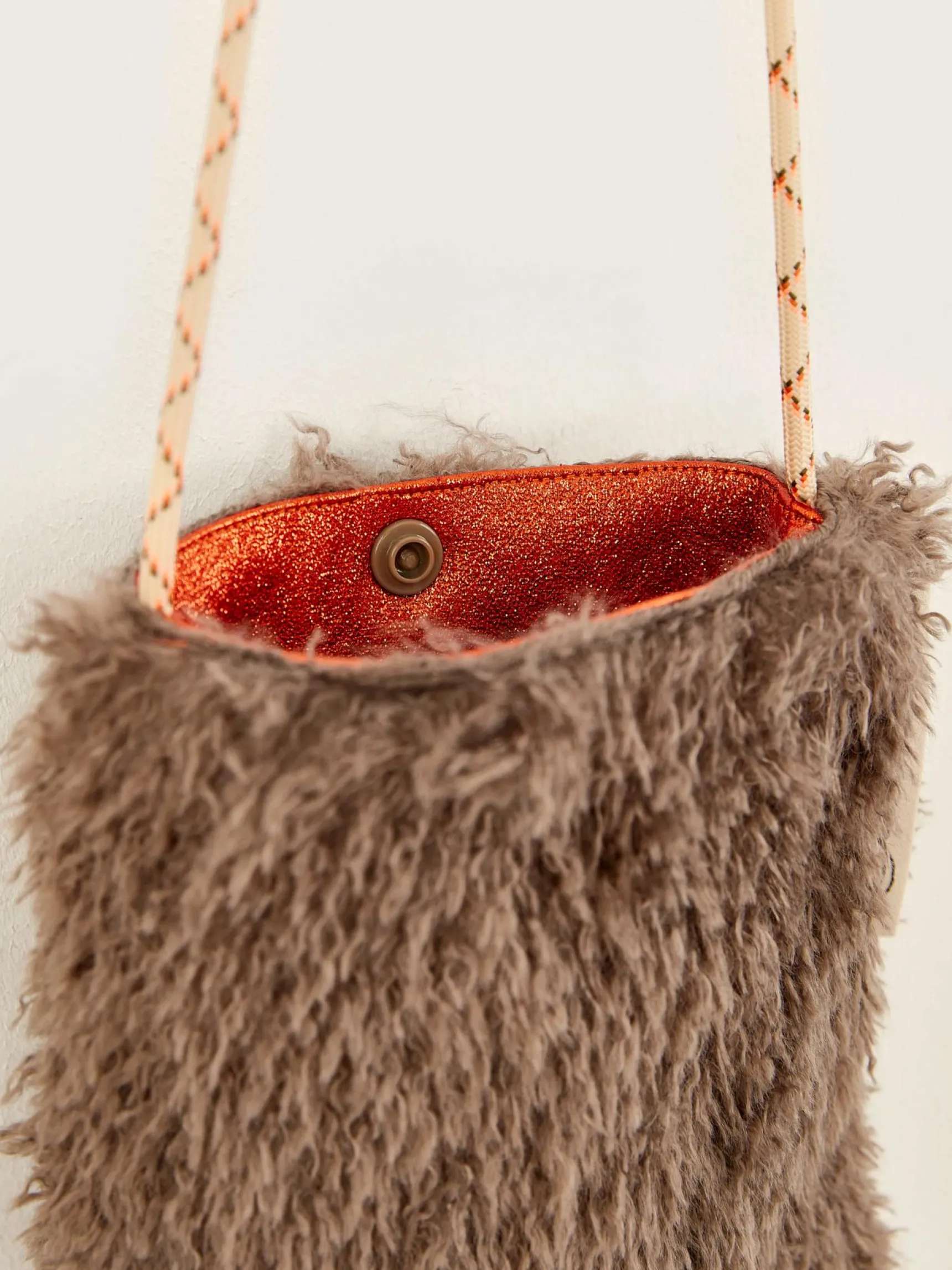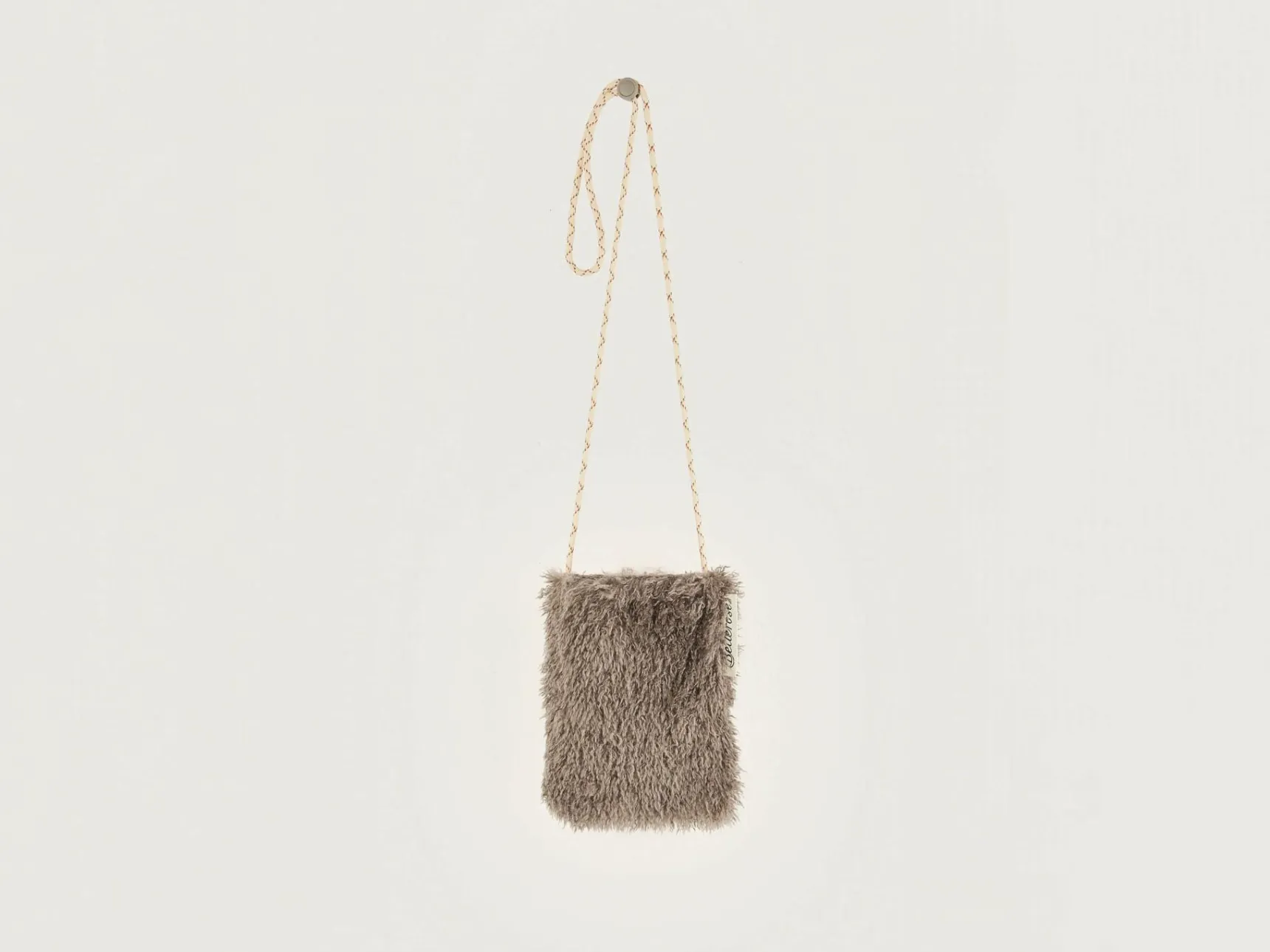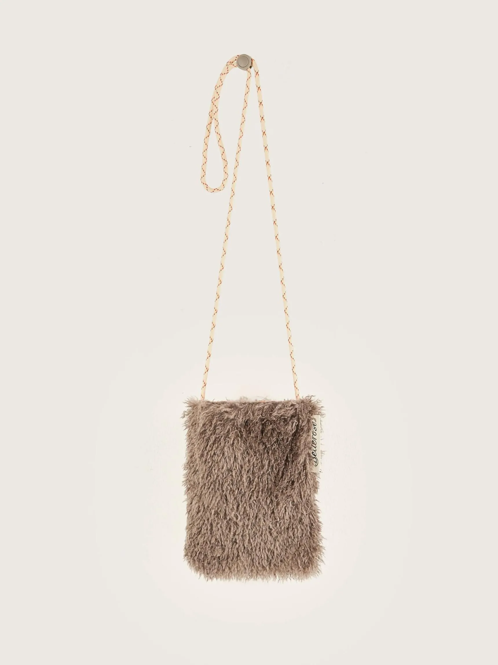 Telefoontasje van beigekleurig nepbont, met een verstelbare schouderriem en een drukknoopsluiting