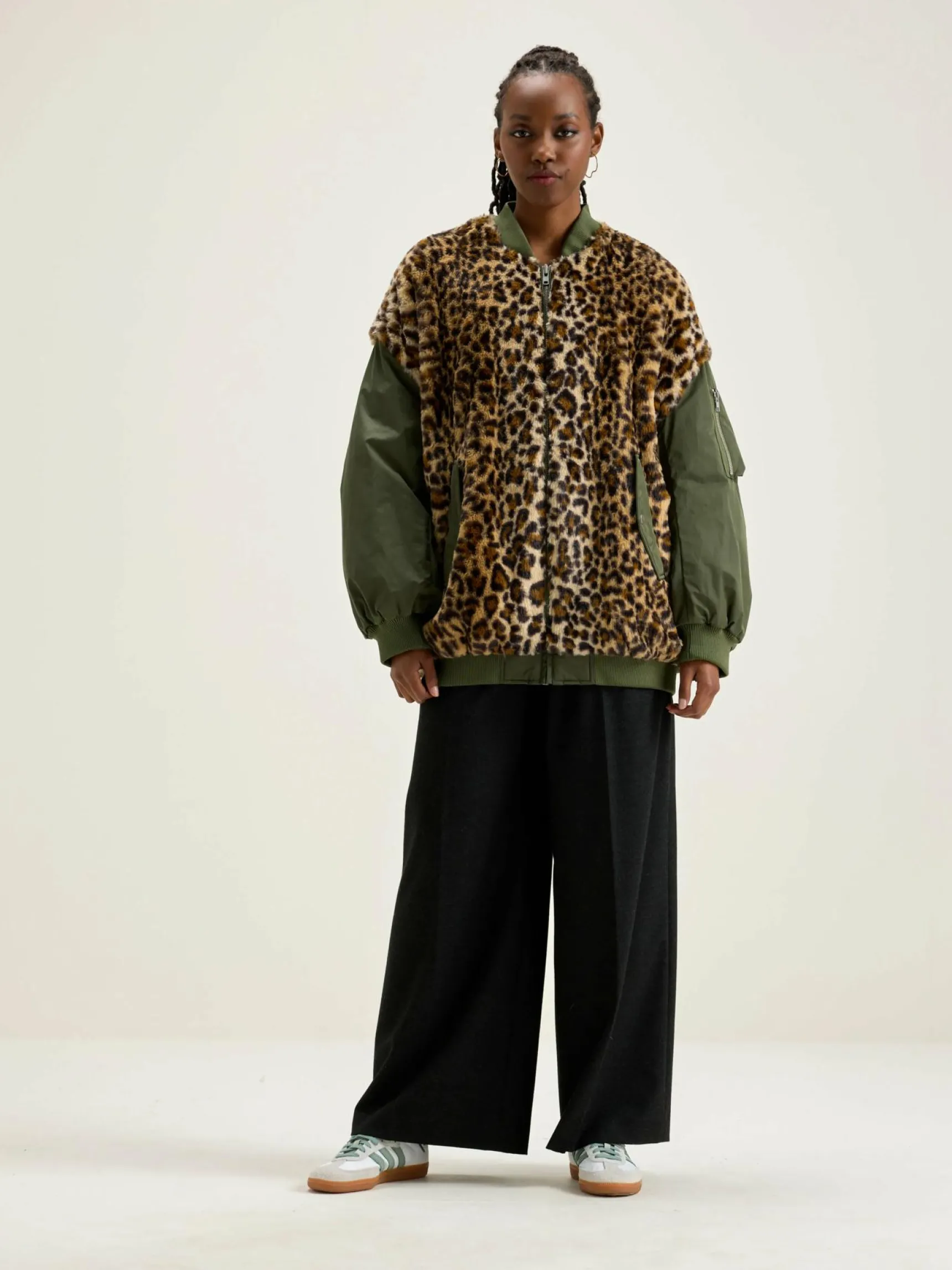 Oversizede bomberjas met body van nepbont met luipaardprint en mouwen van kaki satijncanvas.