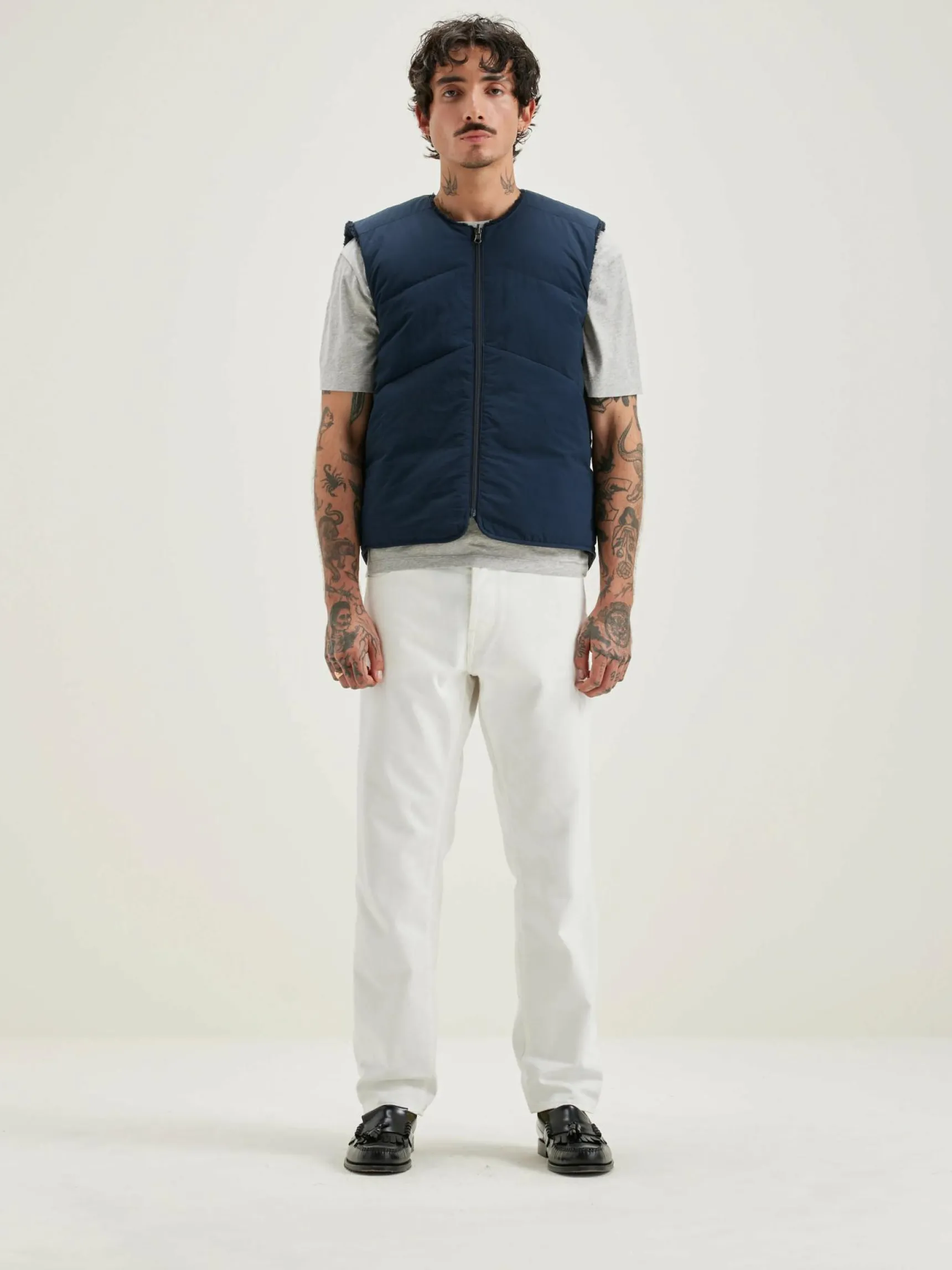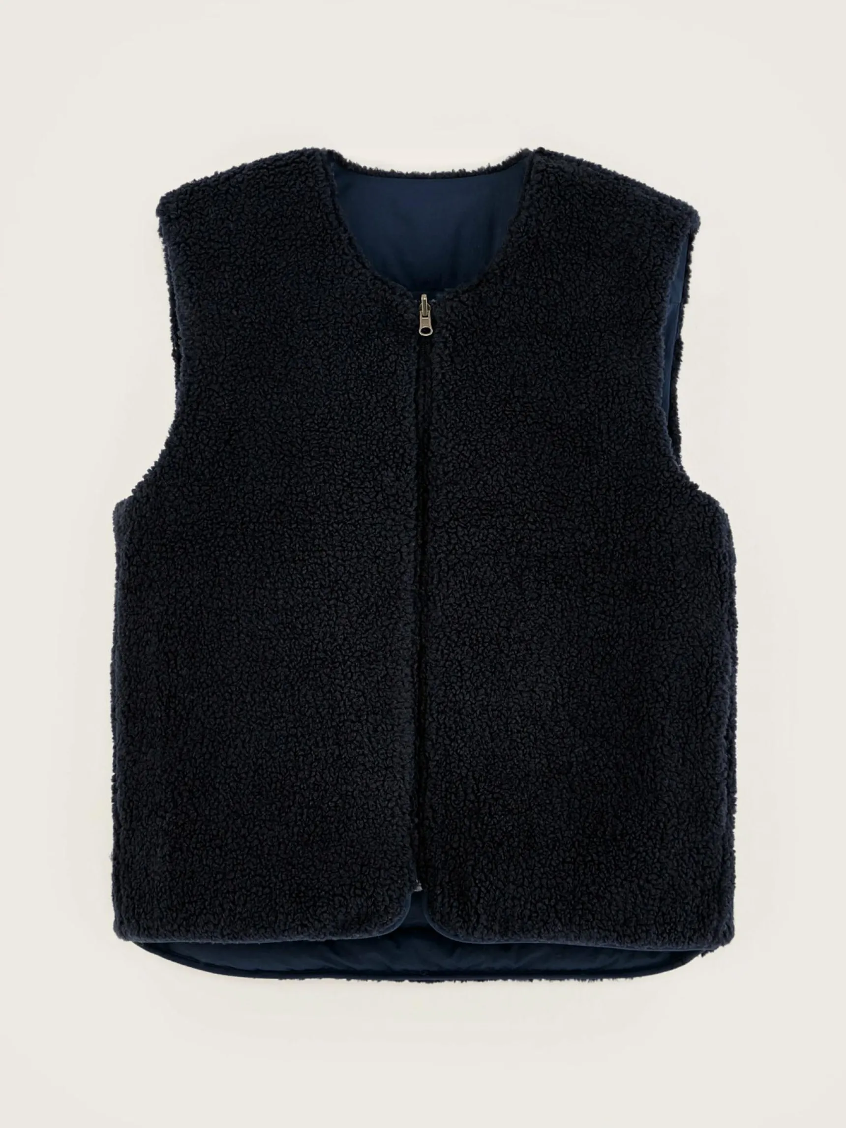 Omkeerbare, donkerblauwe bodywarmer van polyester, met een teddyvoering en ritssluiting vooraan.