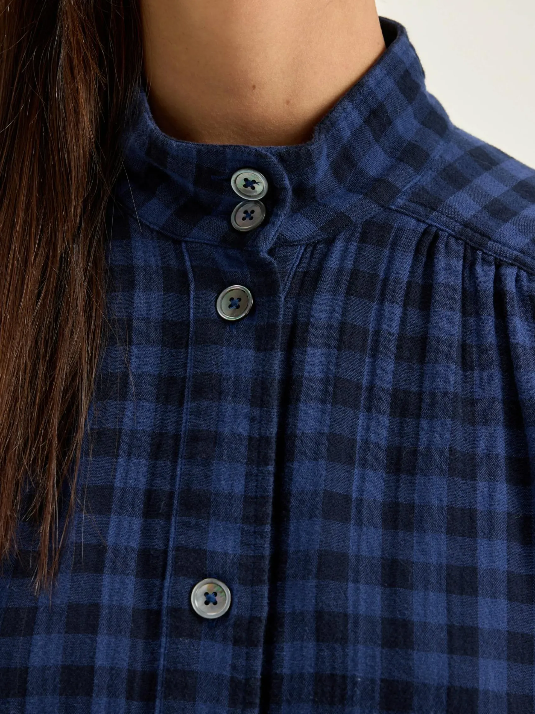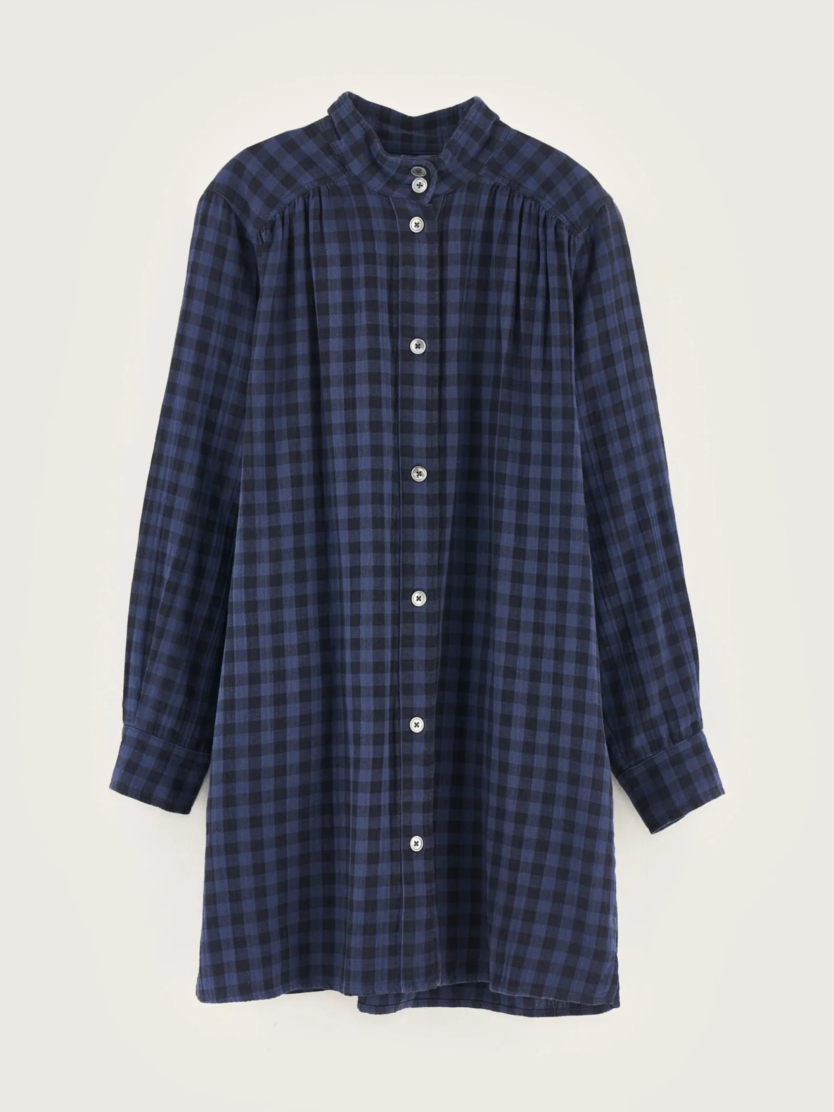 Mini-jurk in hemdstijl, met gefronste details en blauwe ruiten, van katoenen tetrastof.
