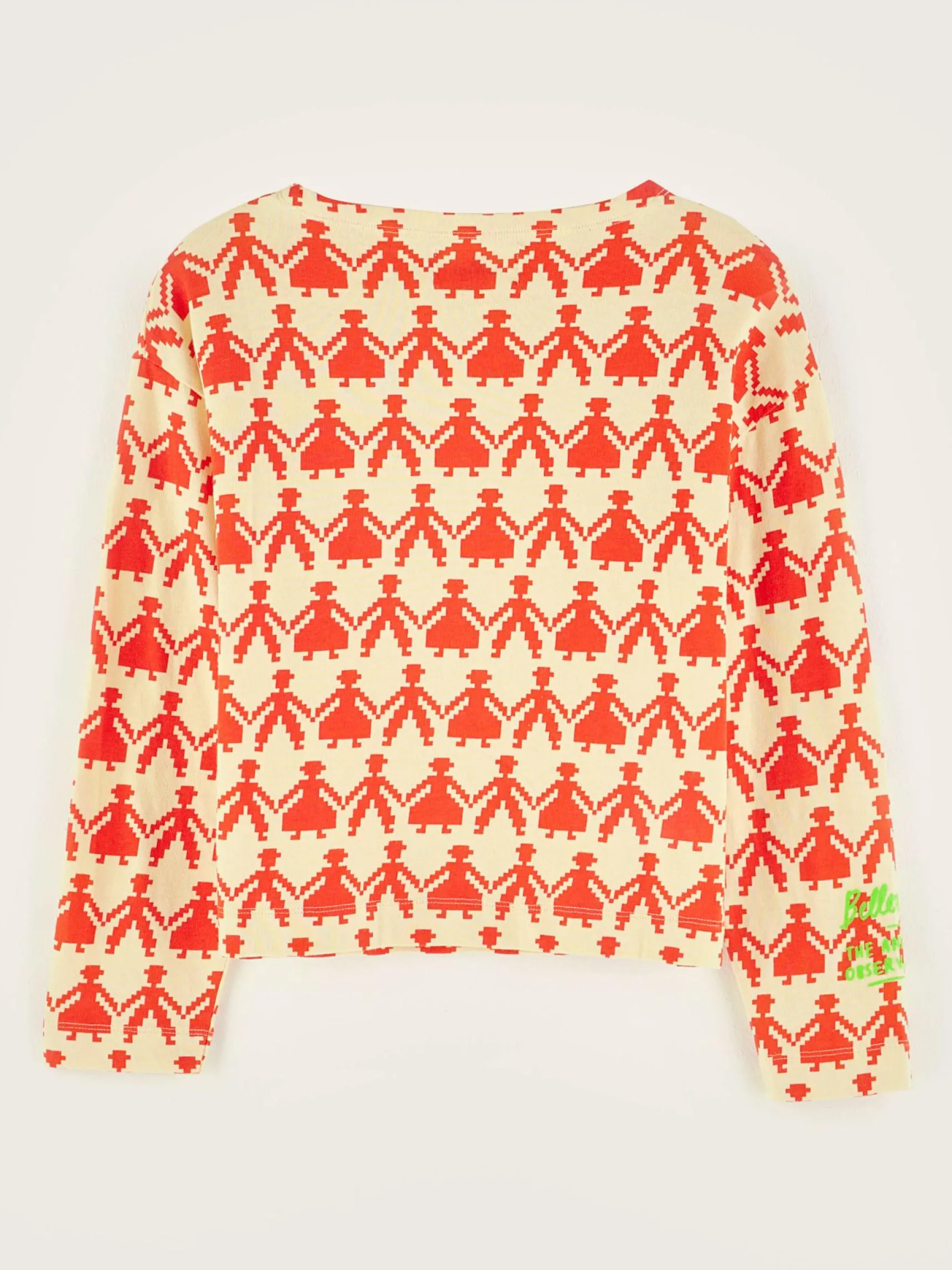 Geel katoenen T-shirt met lange flared mouwen en volledig bedrukt met gepixeleerde figuren.