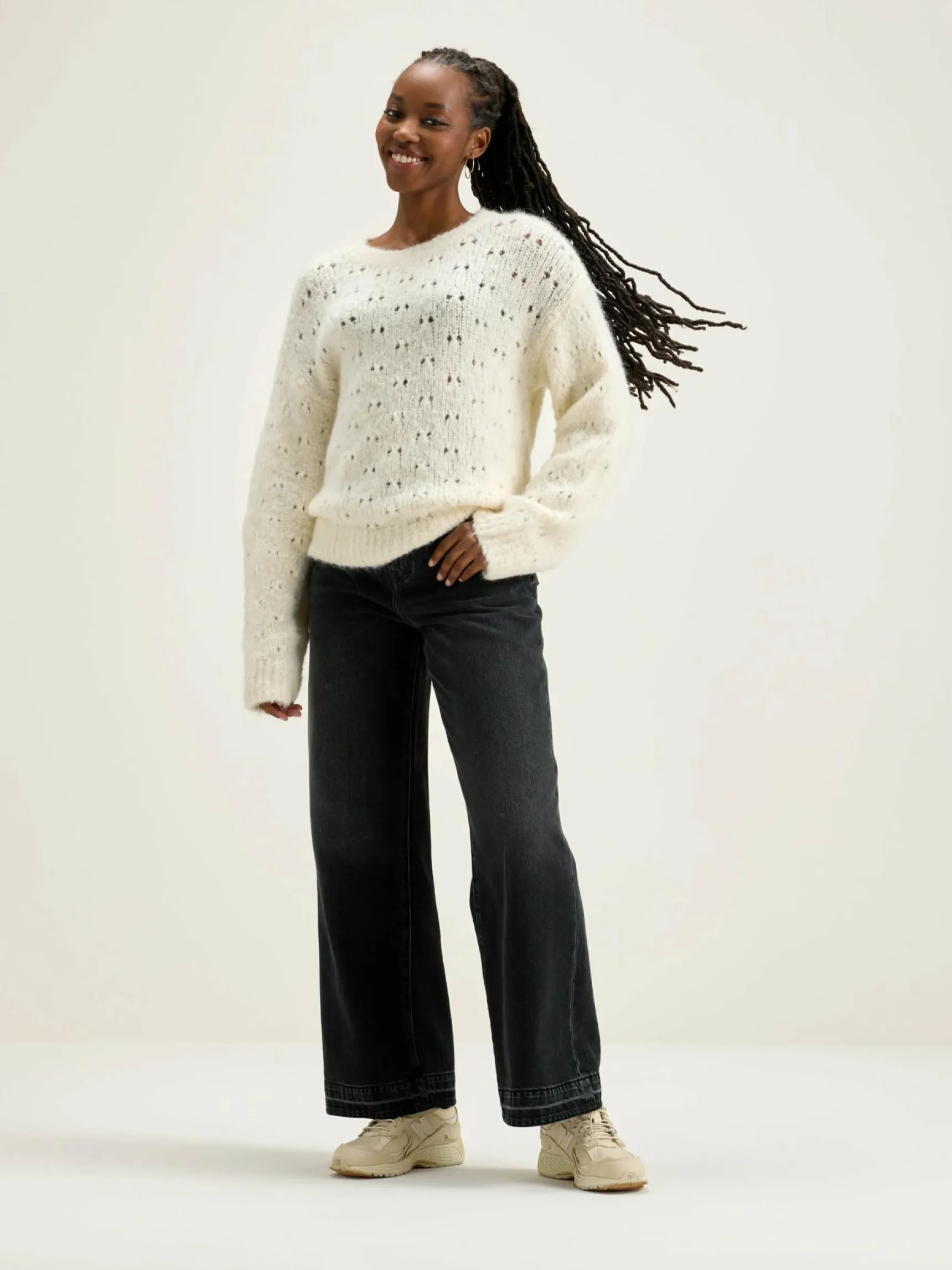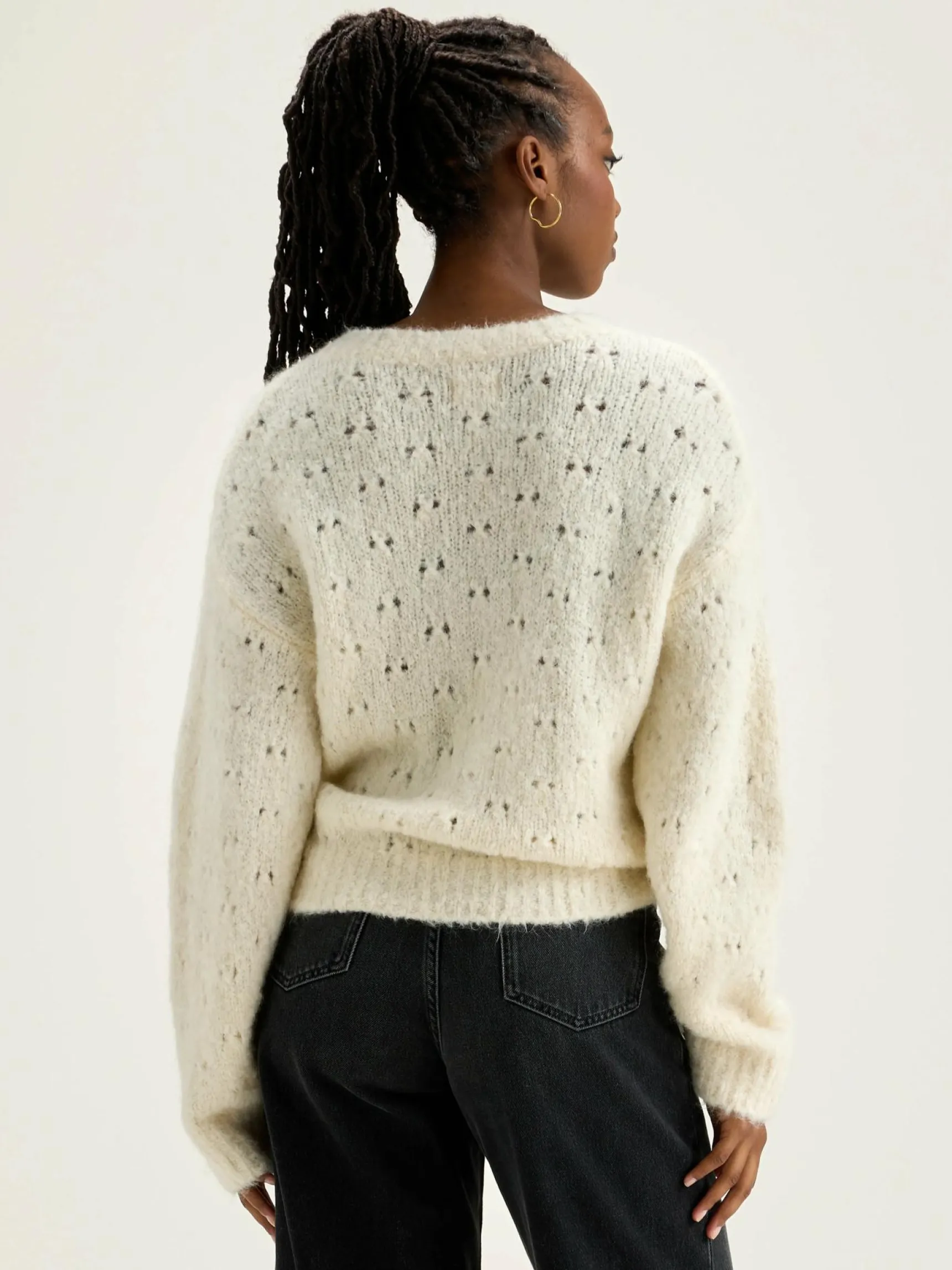 Klassieke trui van open breiwerk in gebroken wit.