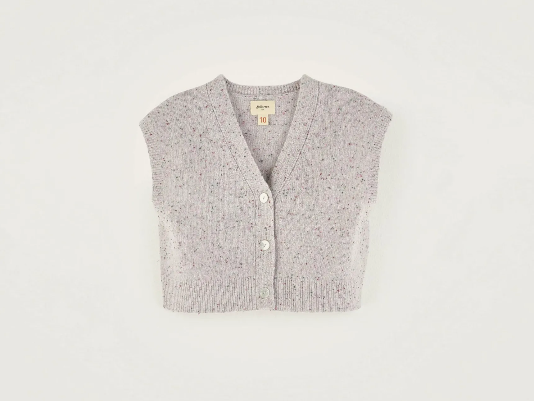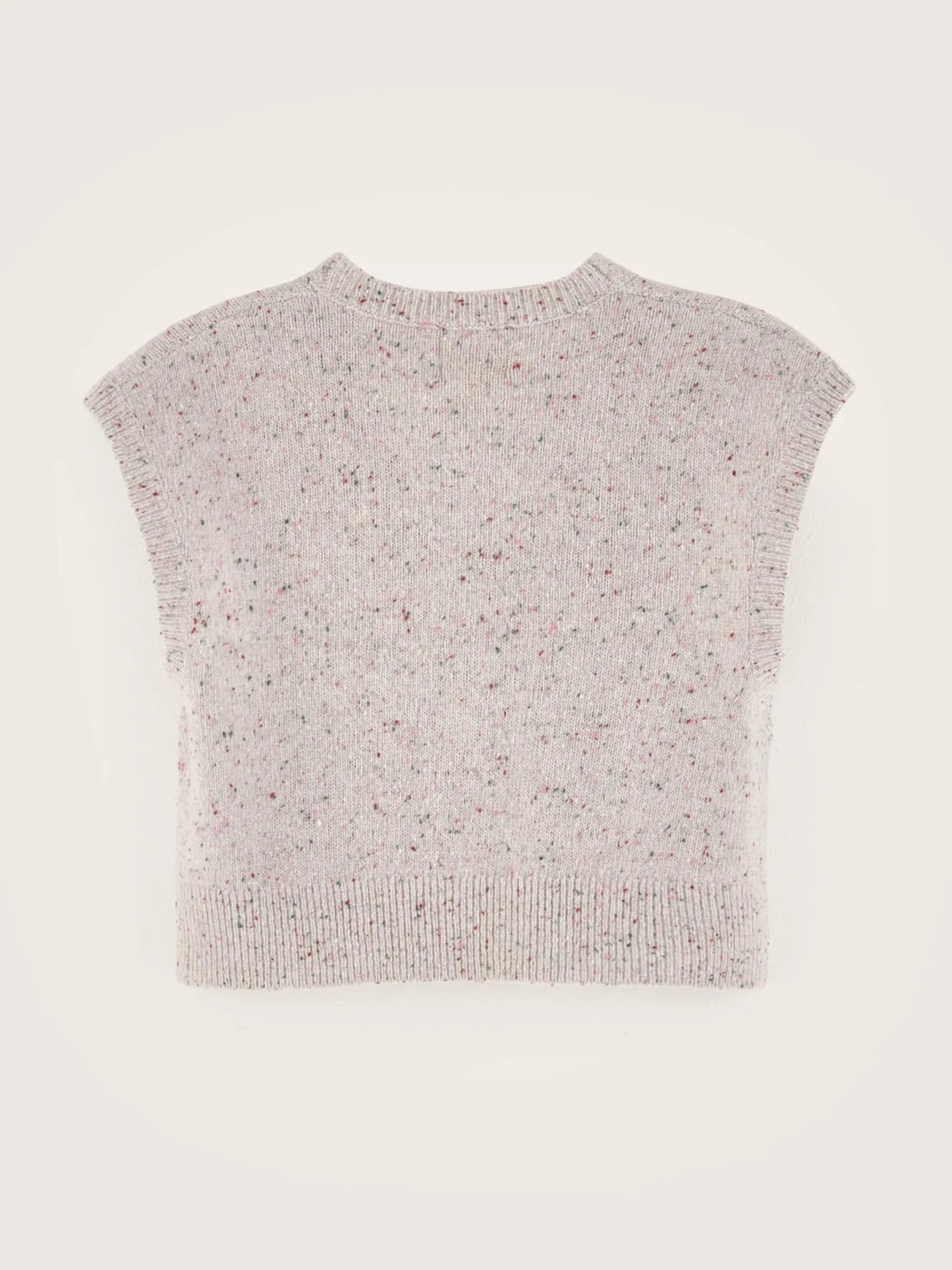 Mouwloos, cropped, gebreid vest met kleurrijke spikkels.