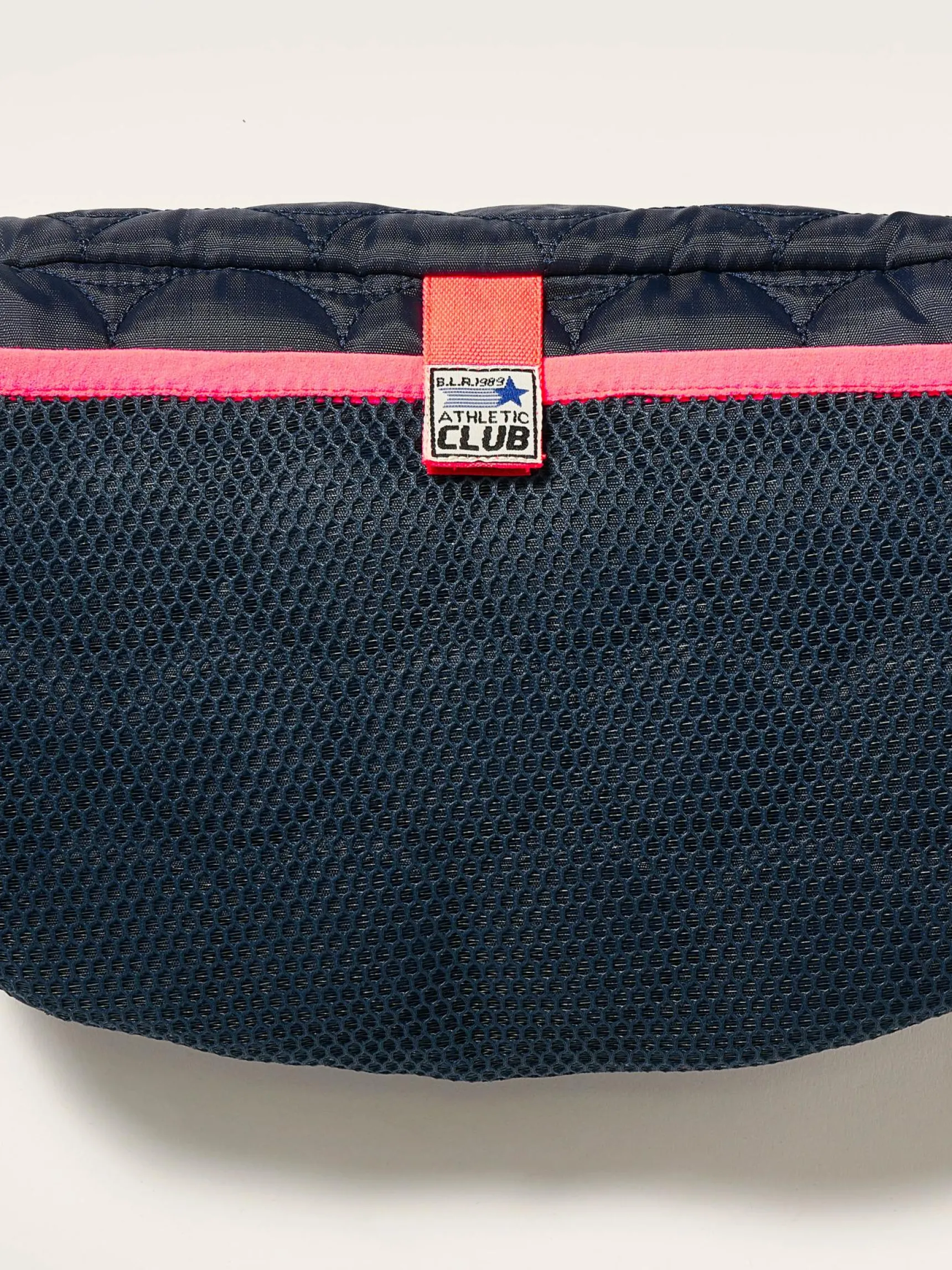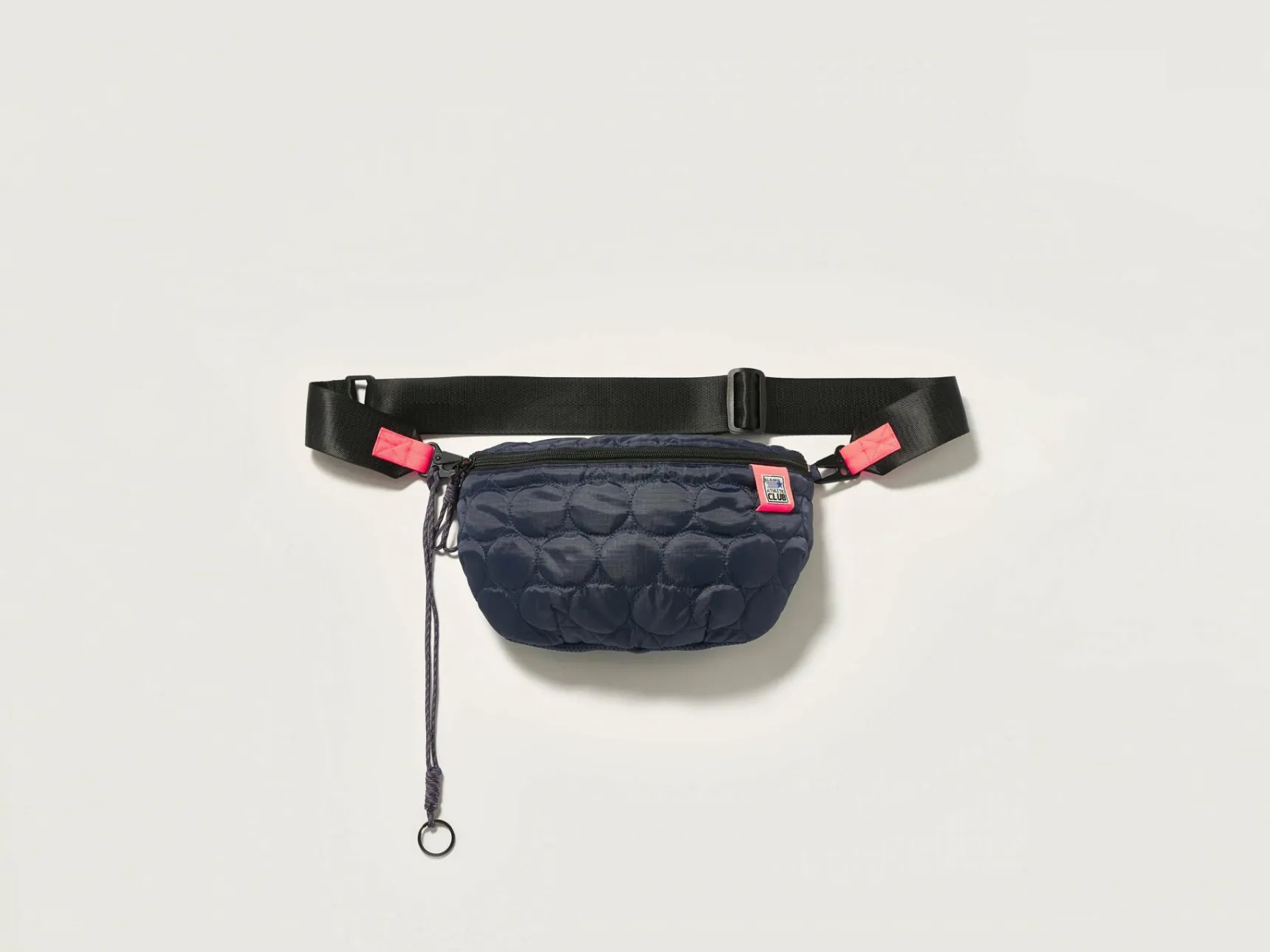 Marineblauwe gewatteerde heuptas in ripstop stof, met details geïnspireerd op klimuitrusting.