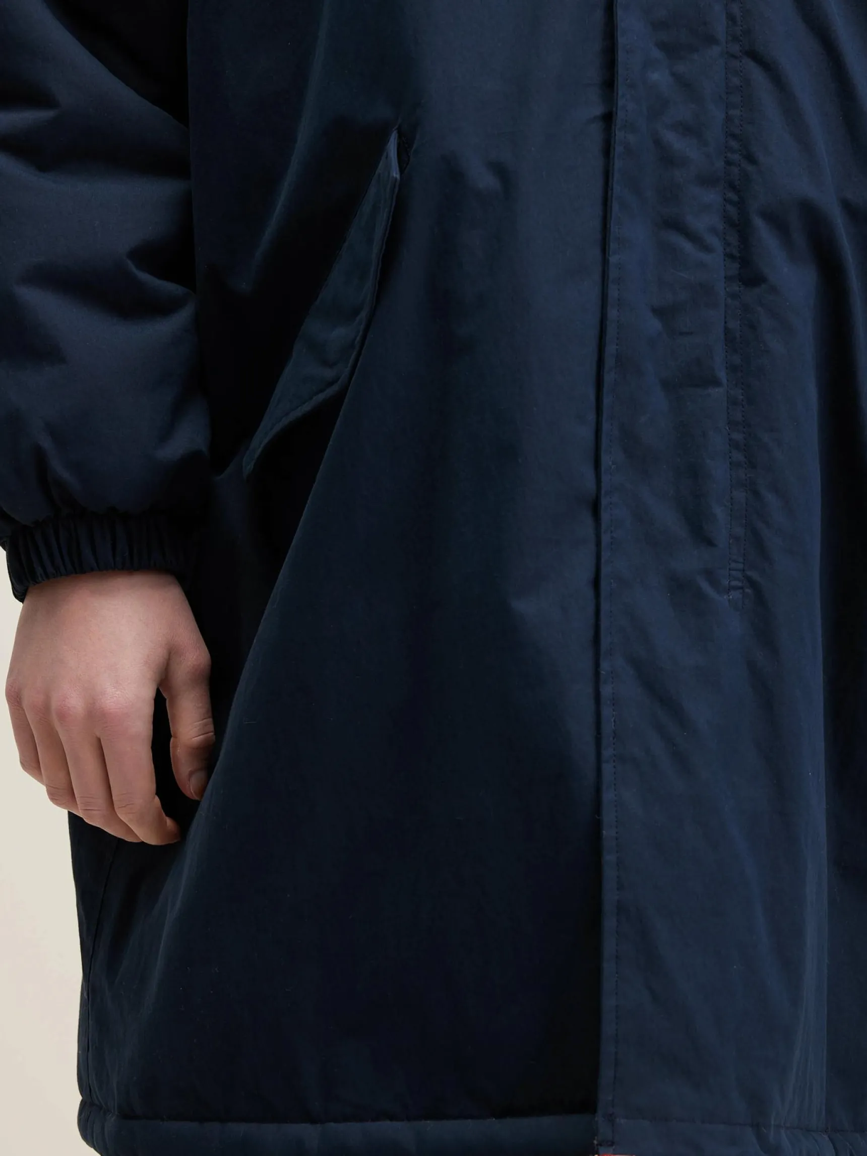 Oversized parka met capuchon in donkerblauw canvaskatoen met raglanmouwen, elastische zomen en voering van ecru imitatiebont.