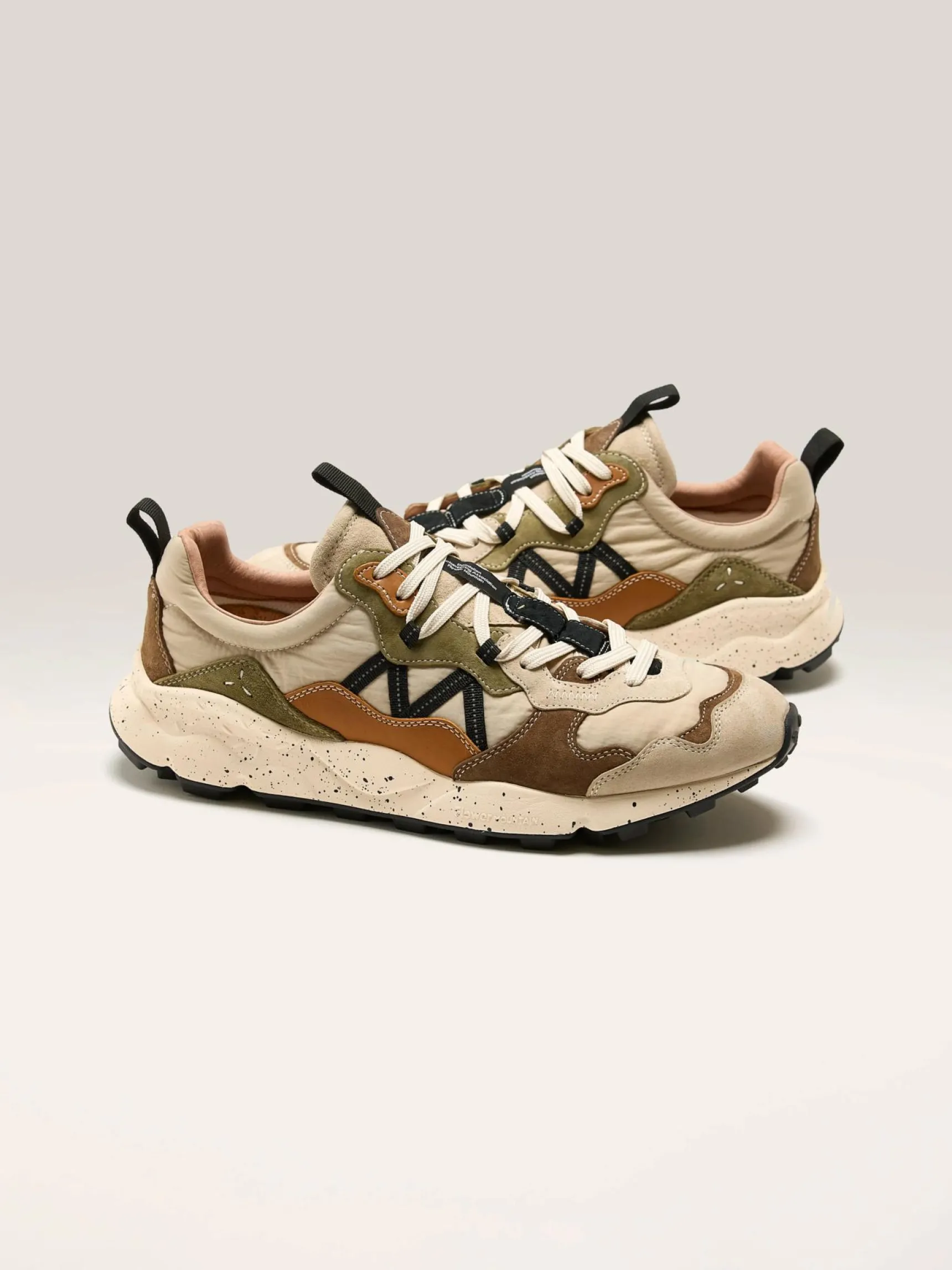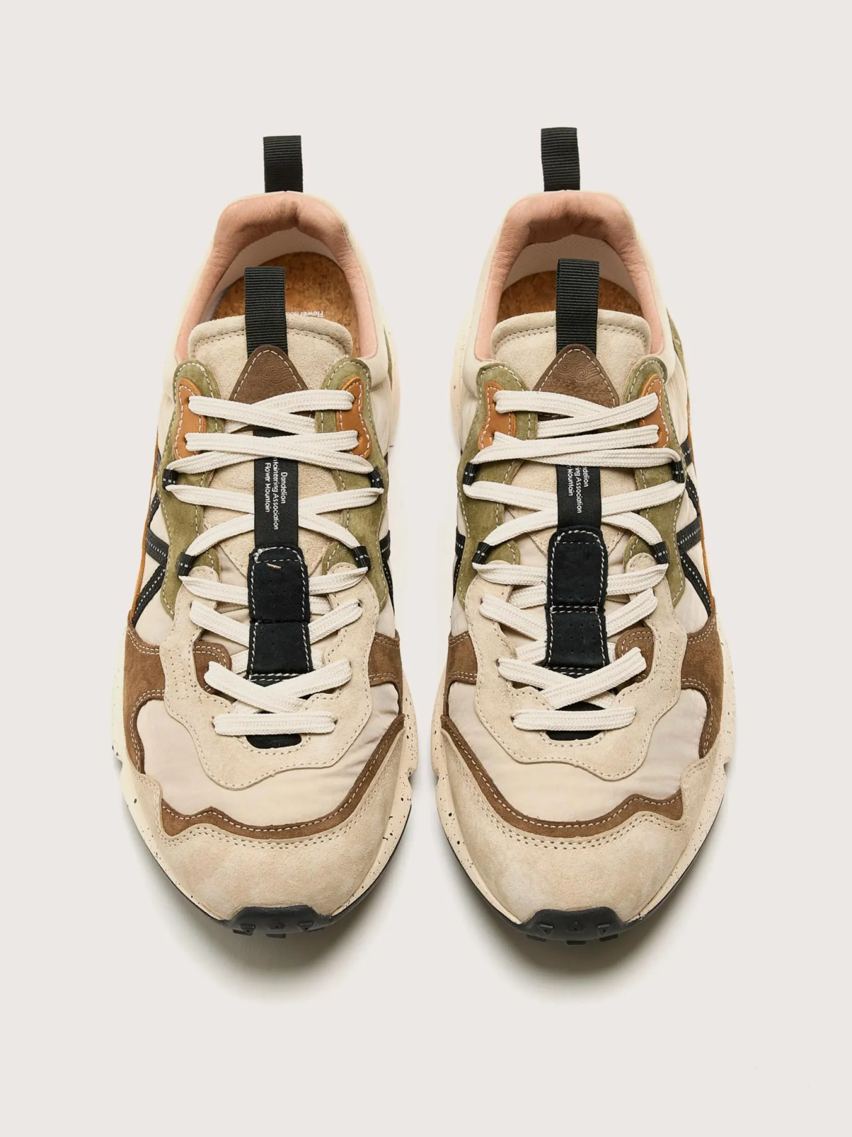 De Flower Mountain Lenzan sneakers hebben een bovenwerk van suède met technische stof en een uitneembare binnenzool van natuurlijk kurk.