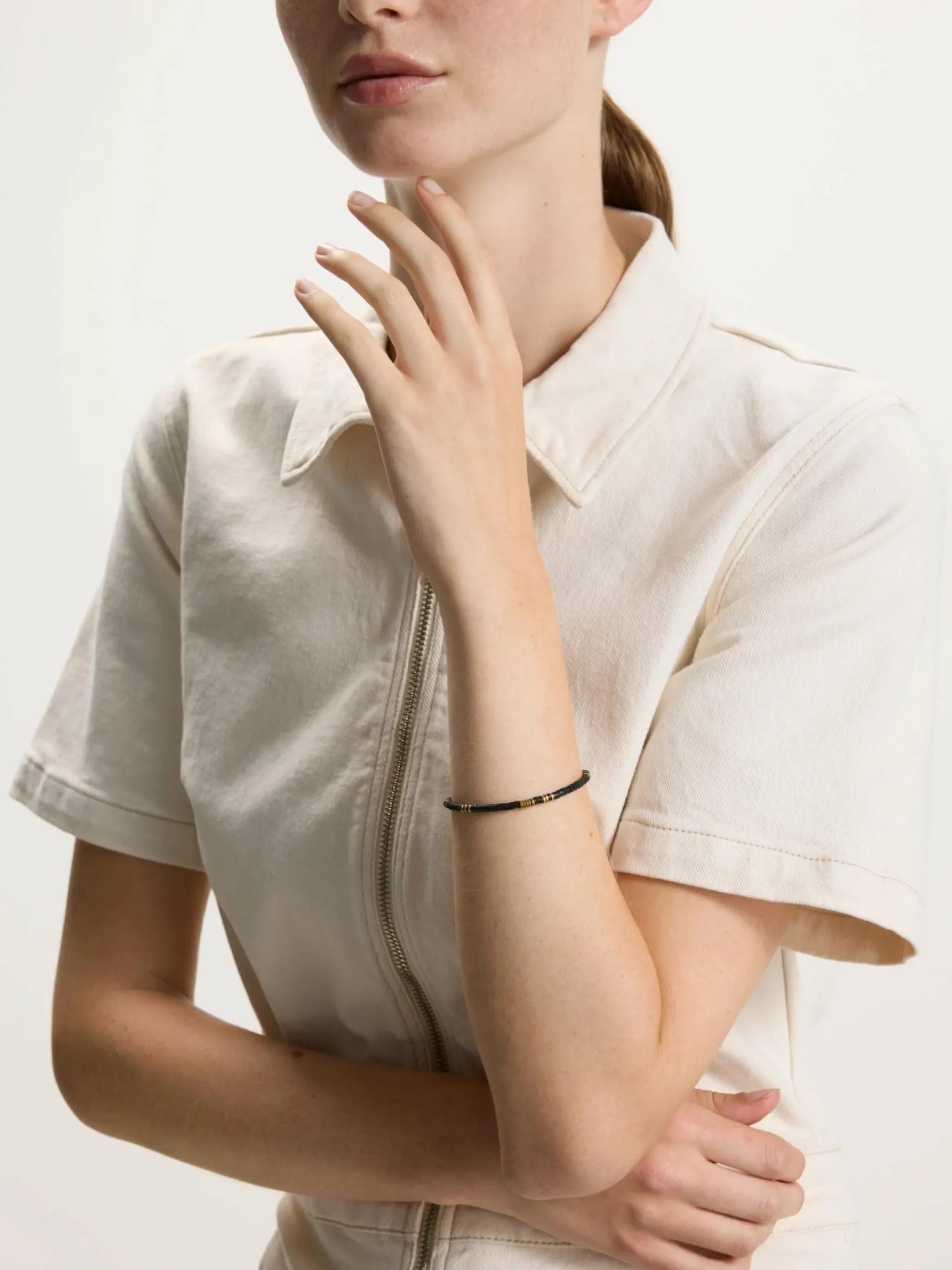 De Maison Mönik Shakku Noir handgemaakte armband is gemaakt van gerecycled Ghanees vinyl en metallic hematietkralen.