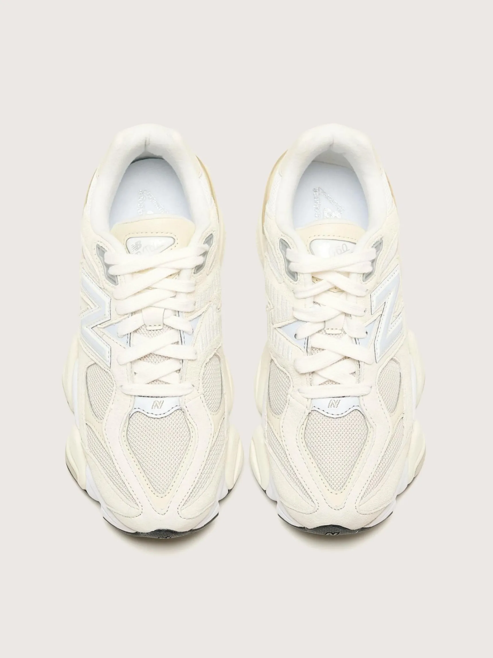 De New Balance 9060 sneakers hebben een technisch bovenwerk van leder, suède en mesh, een dempende middenzool en een buitenzool met een diamanten patroon.