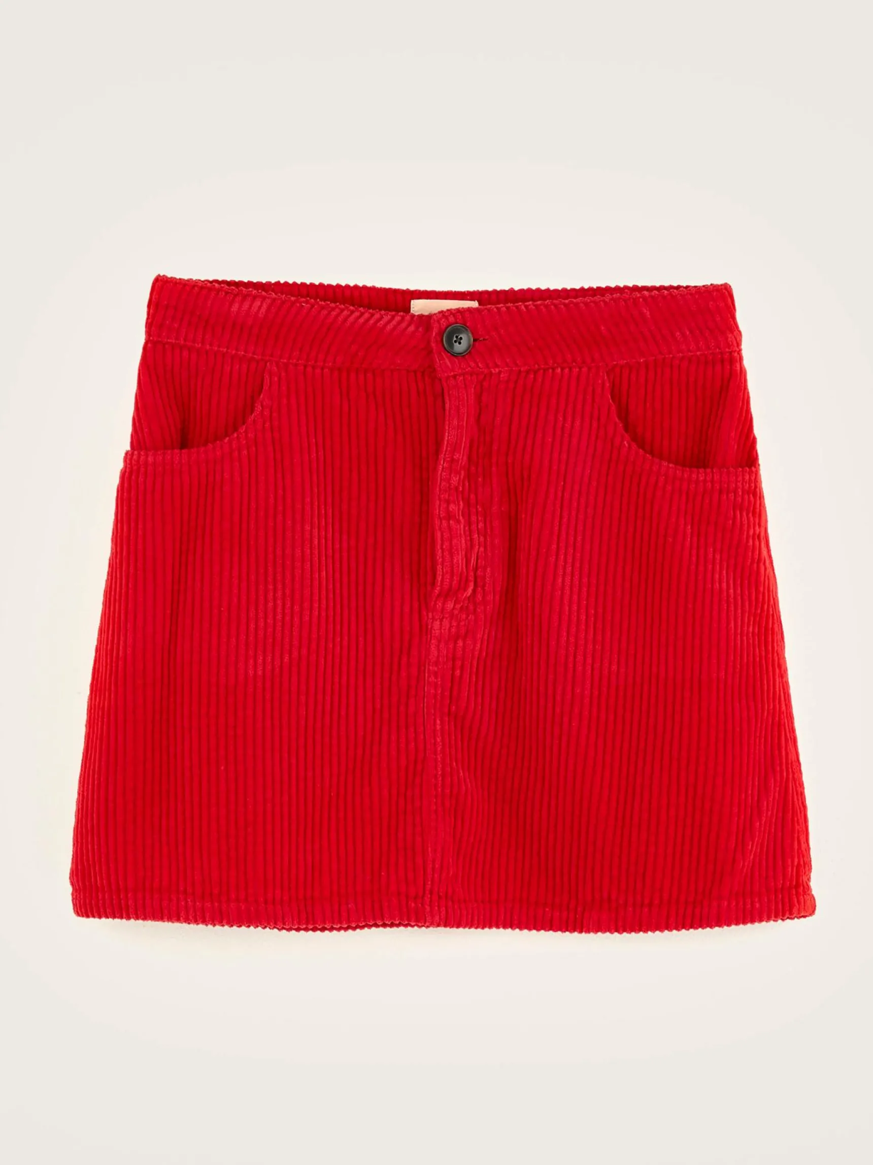Donkerrode, trapeziumvormige minirok in five-pocketstijl, corduroy met brede rib.