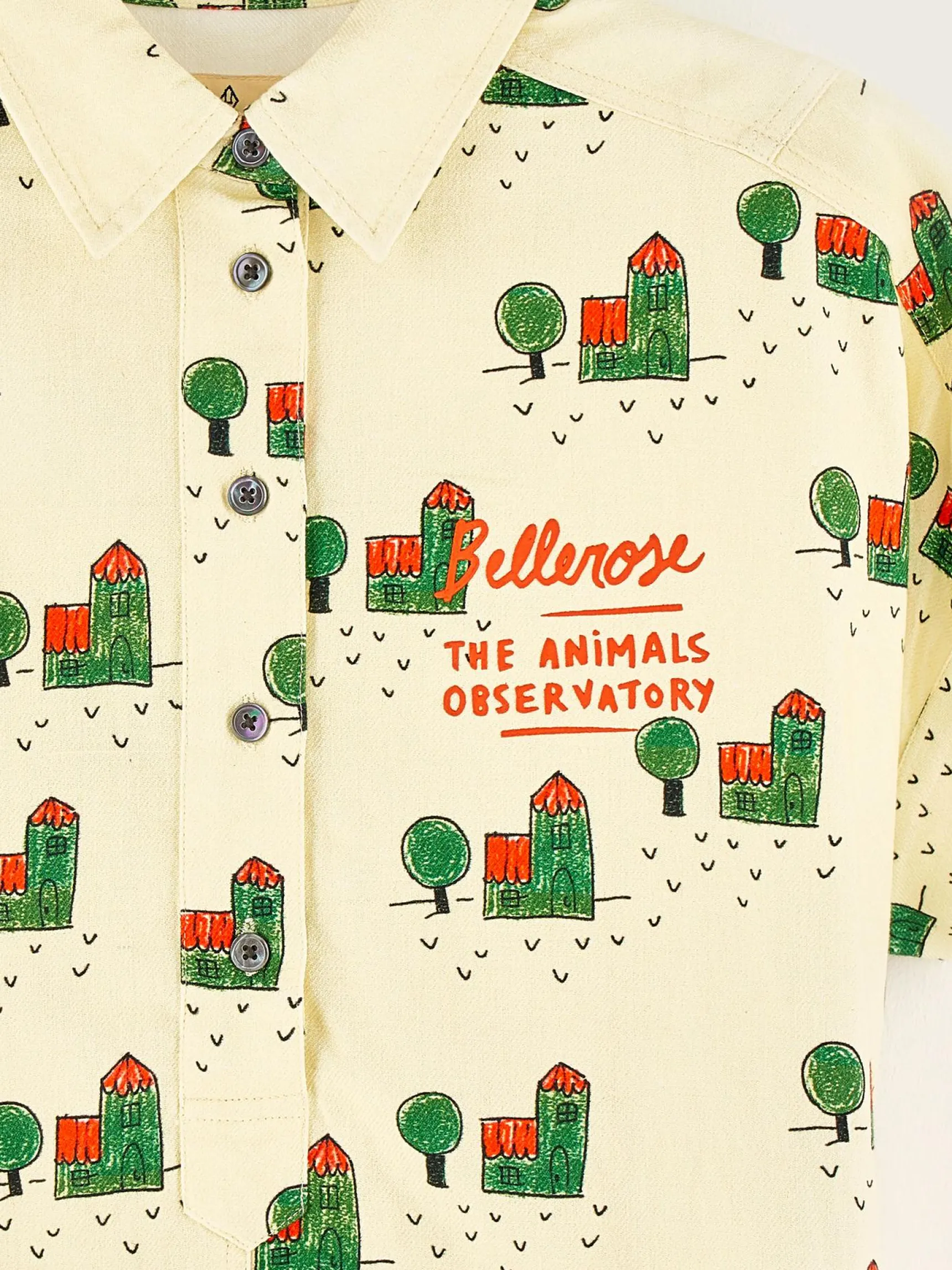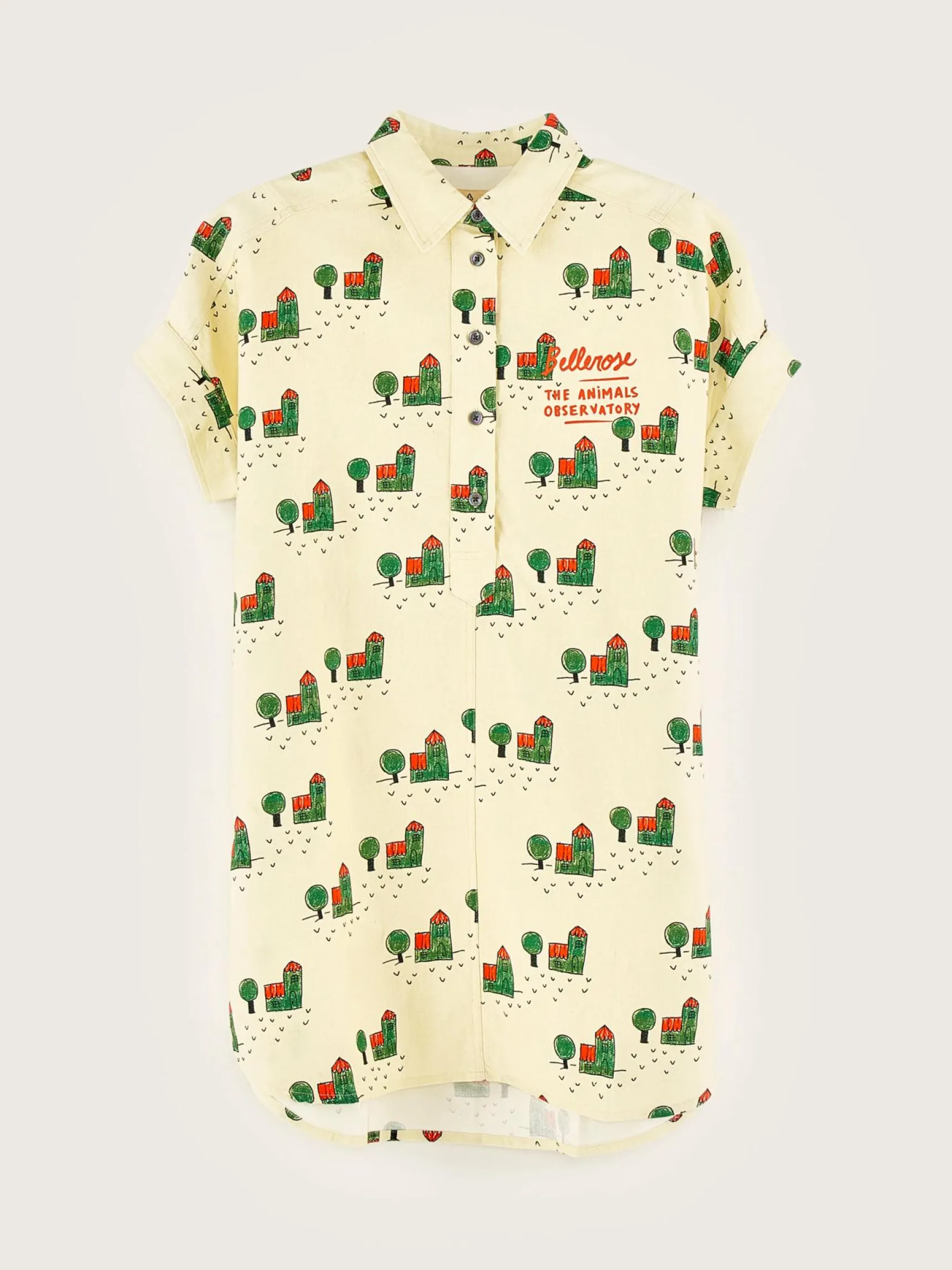 Rechte hemdjurk van geel katoen, volledig bedrukt met een boerderijprint en Bellerose x The Animal Observatory-signatuur.