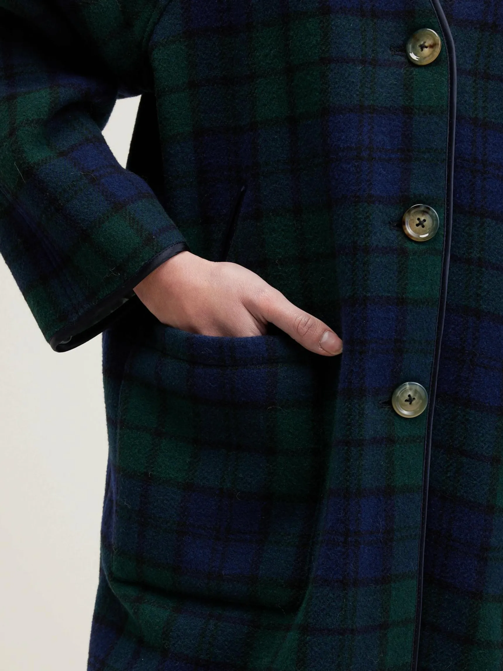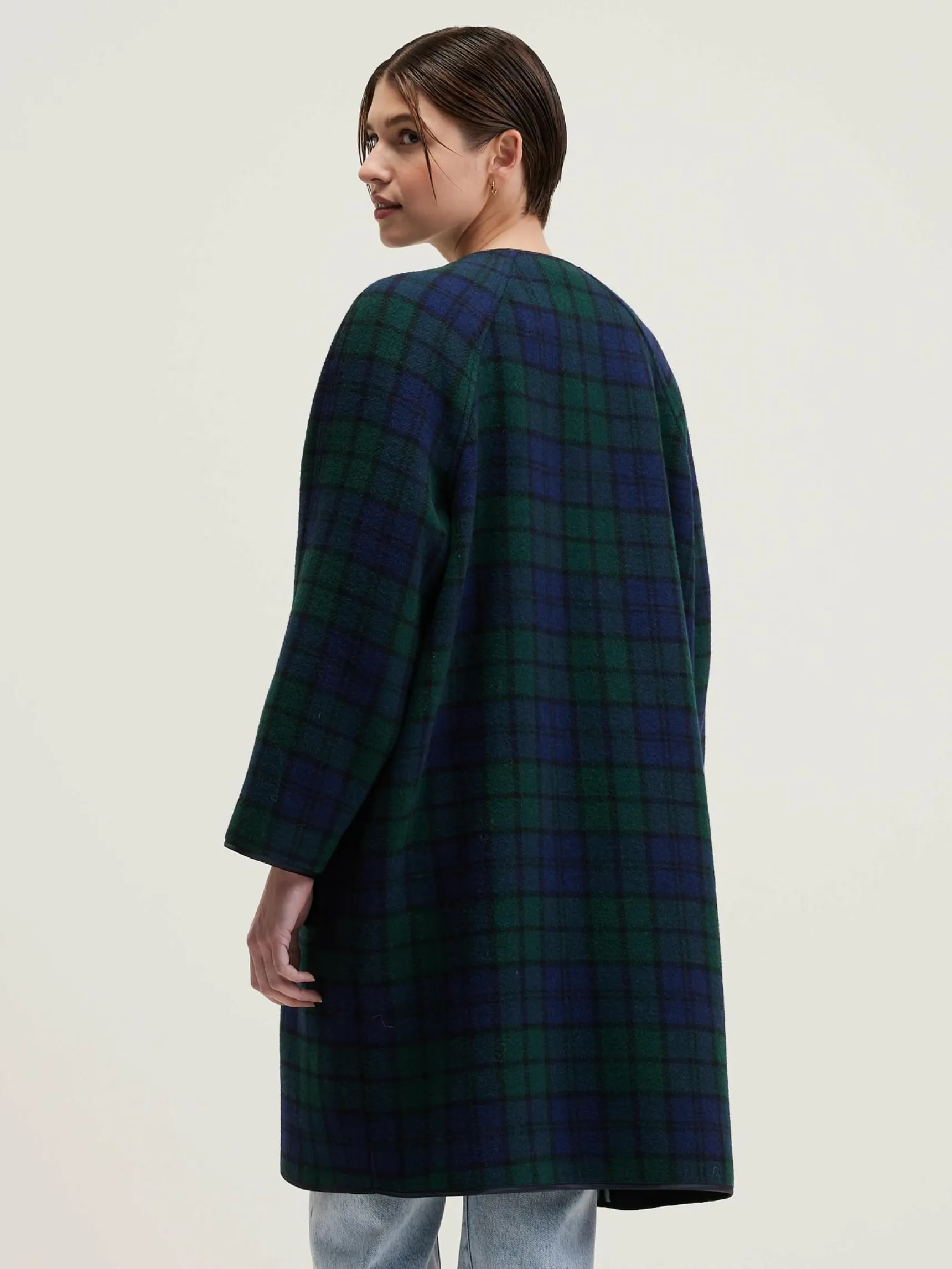Lange mantel zonder kraag, met v-hals, in black watch ruiten.