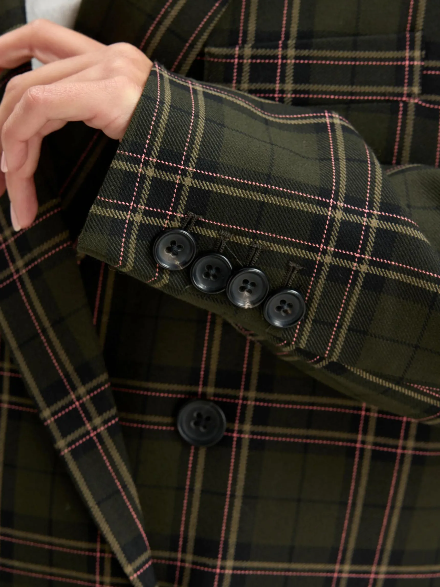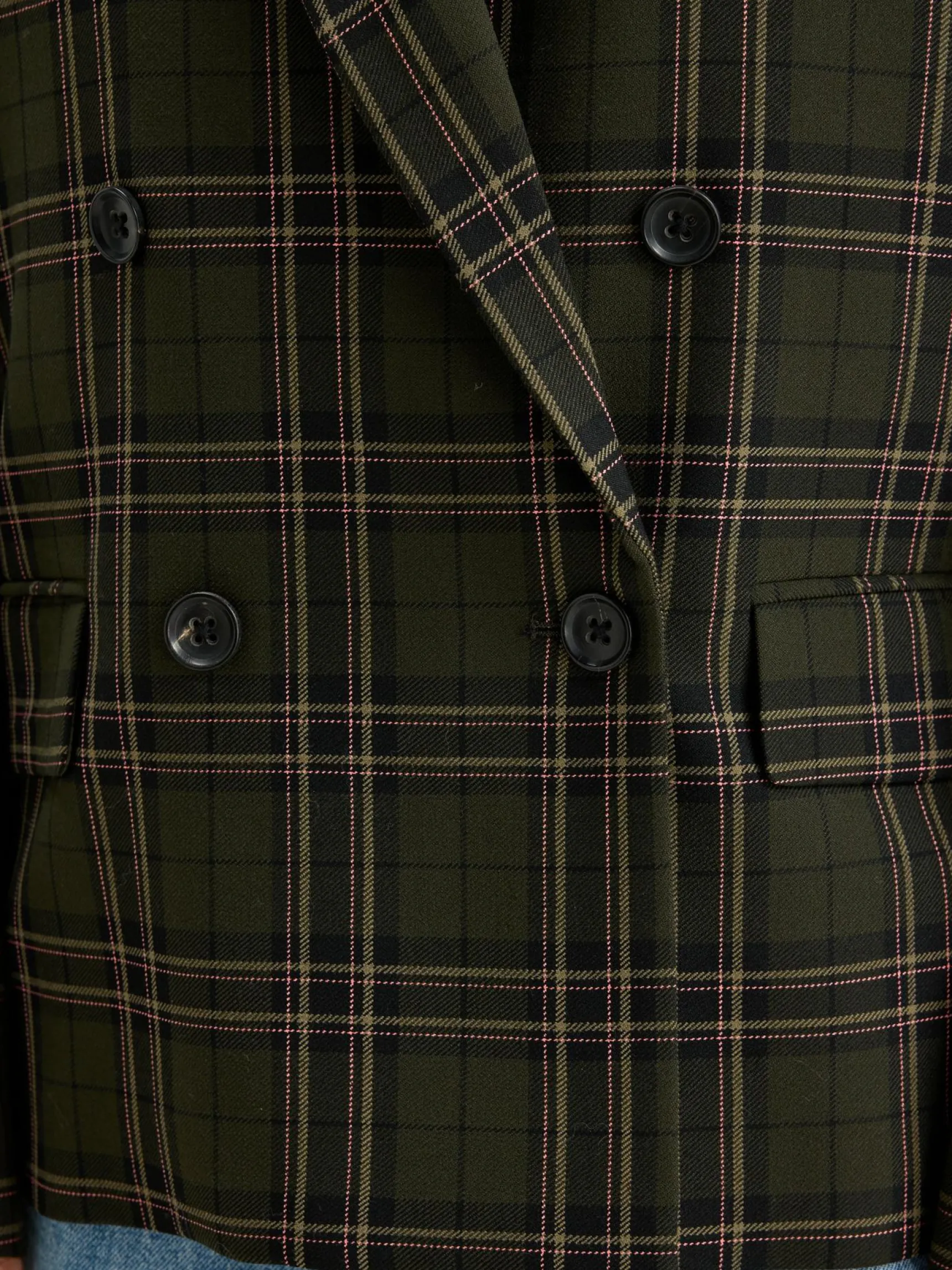 Double-breasted, oversizede blazer met recht model, in een kaki geruite stof.