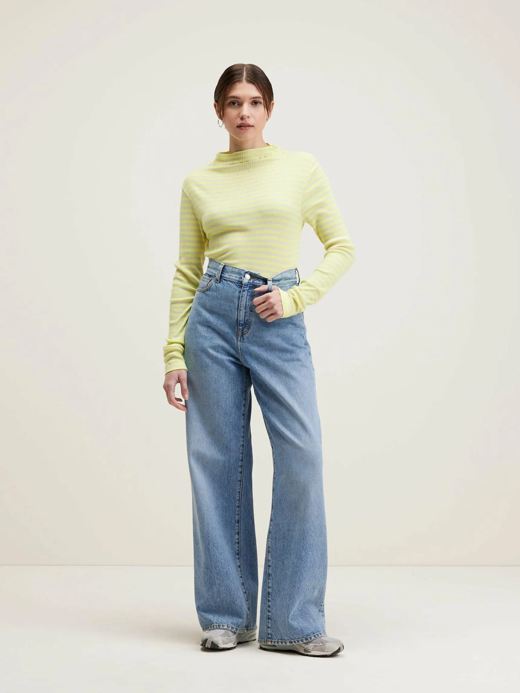 Licht, slim fit T-shirt, geribd en met gele strepen.