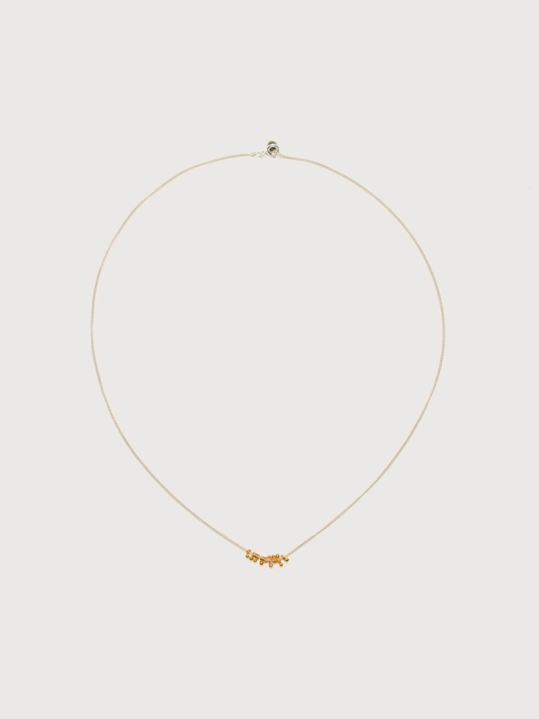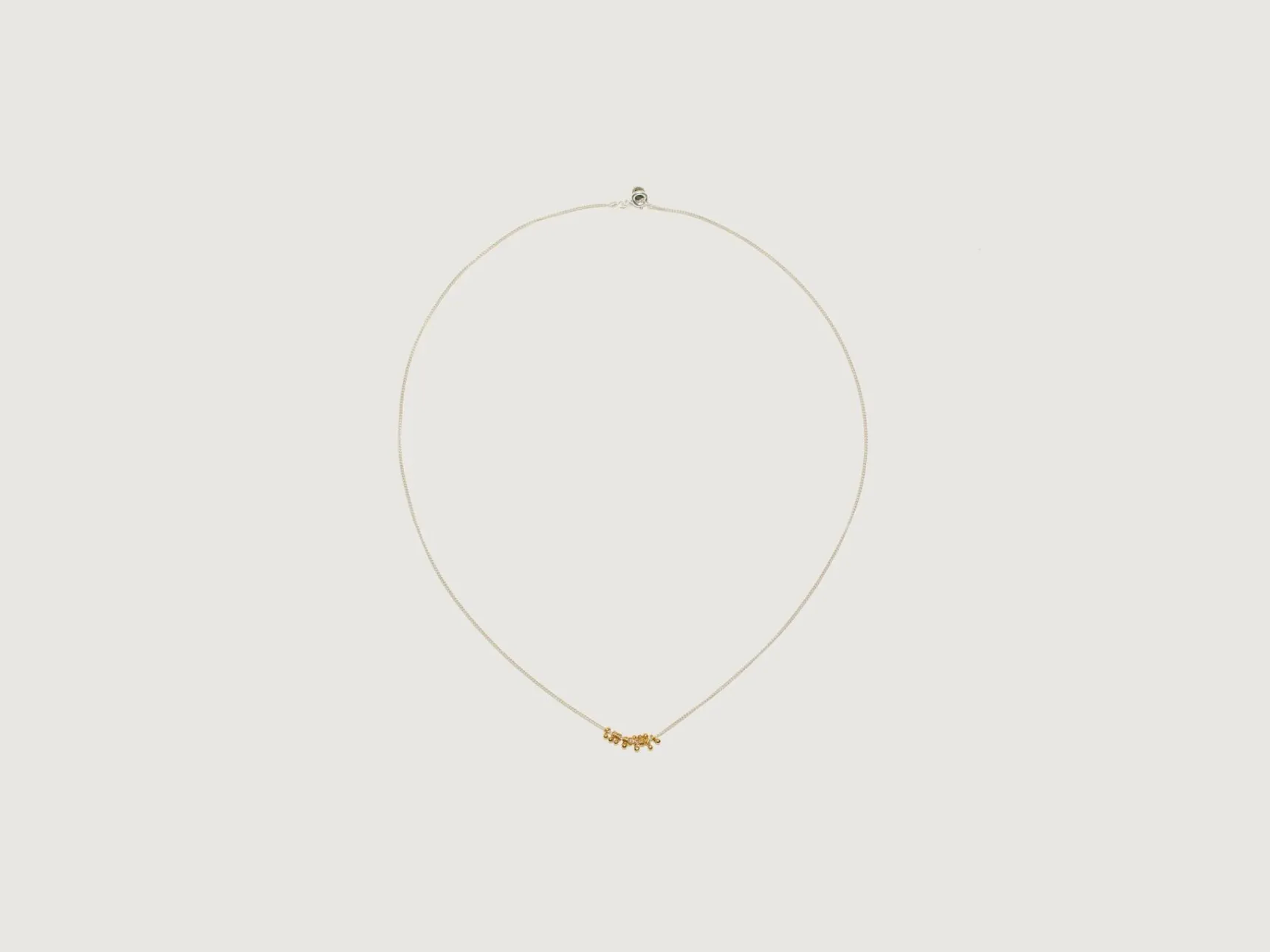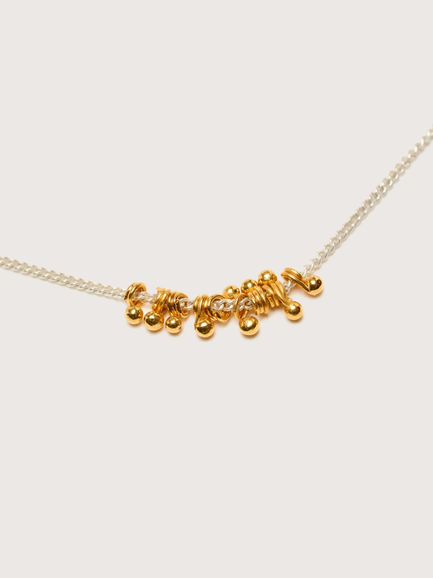 De GilberGilbert Bubble ketting is een lange zilveren ketting met gouden bolletjes.