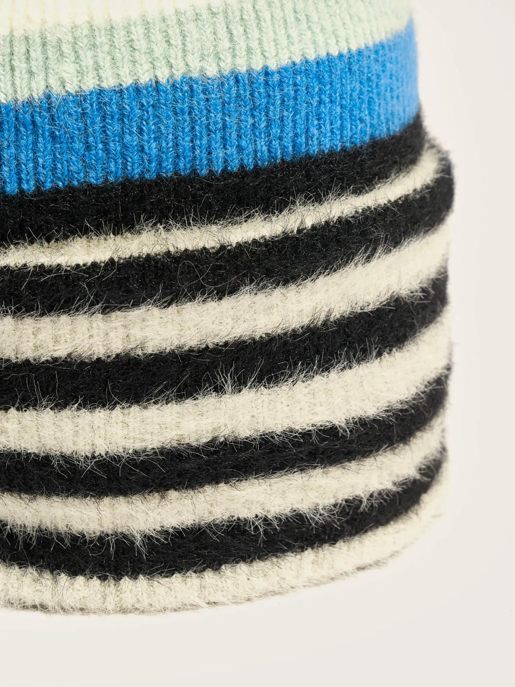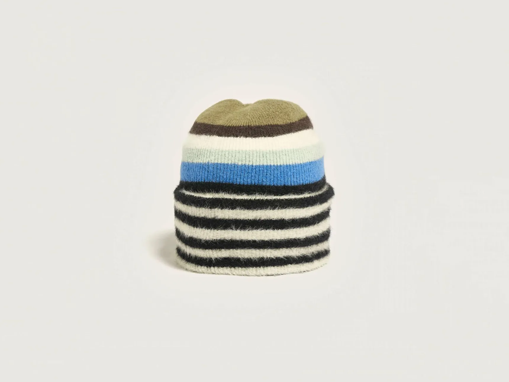 Getextureerde en gestreepte muts in marineblauwe, beige en bruine schakeringen.