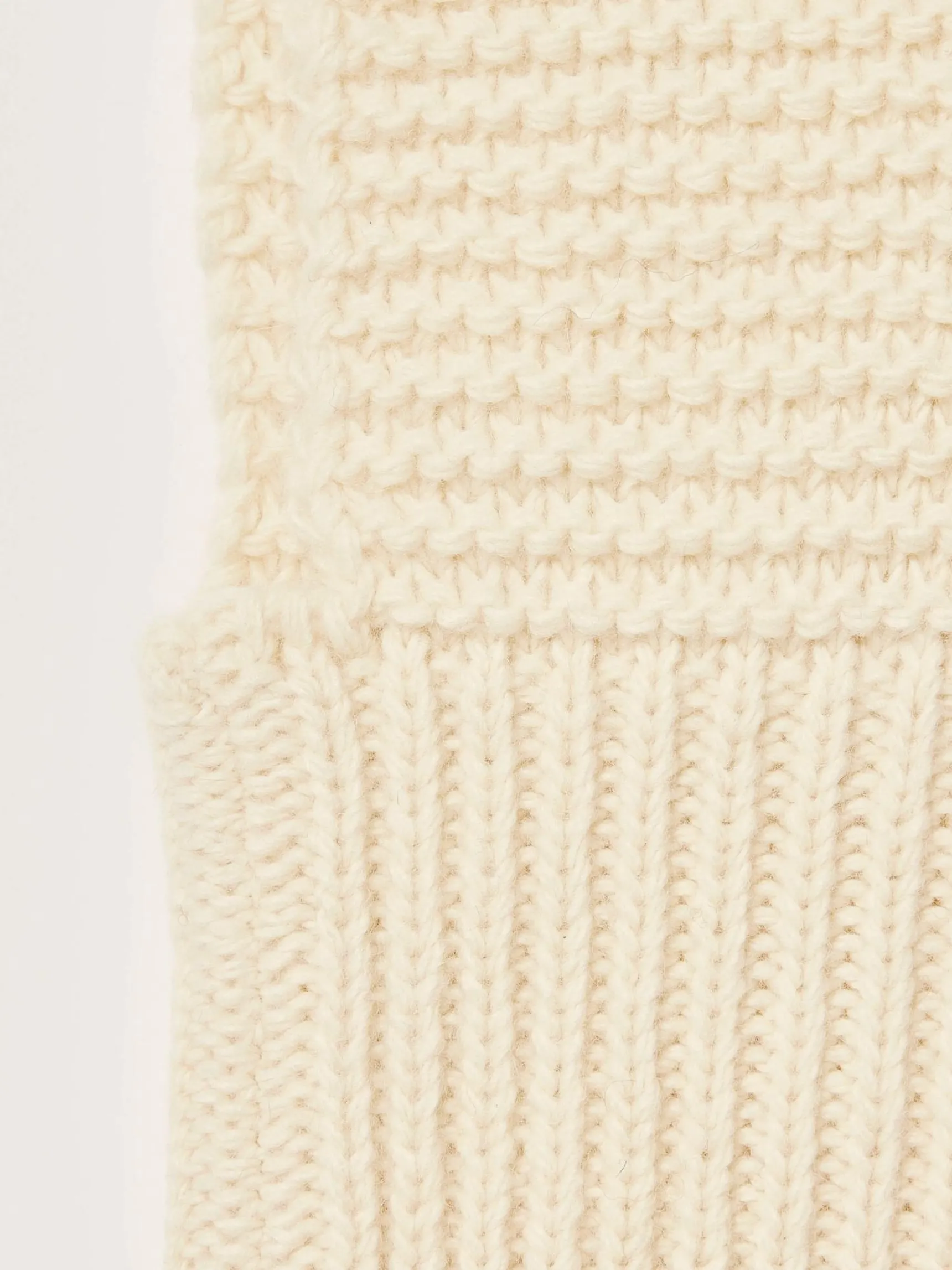 Ivoorwitte, gebreide balaclava van dik garen, met Bellerose-label op de achterkant.