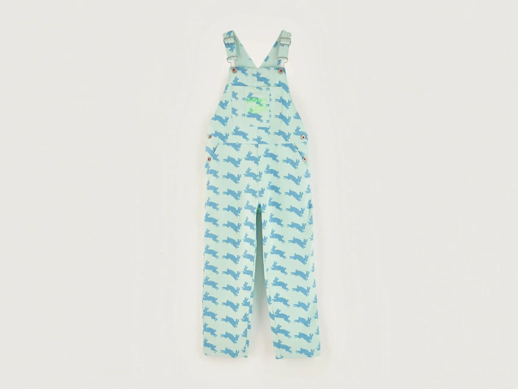 Comfortabele blauwe katoenen salopette, volledig bedrukt met konijnmotief en Bellerose x The Animal Observatory-signatuur.