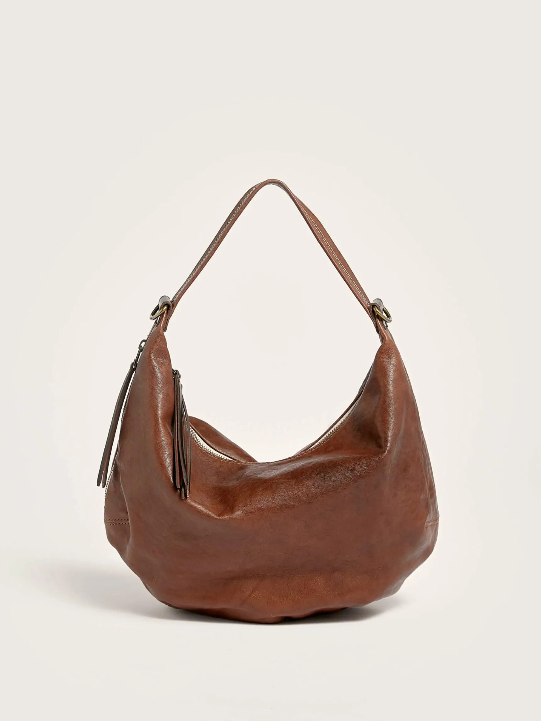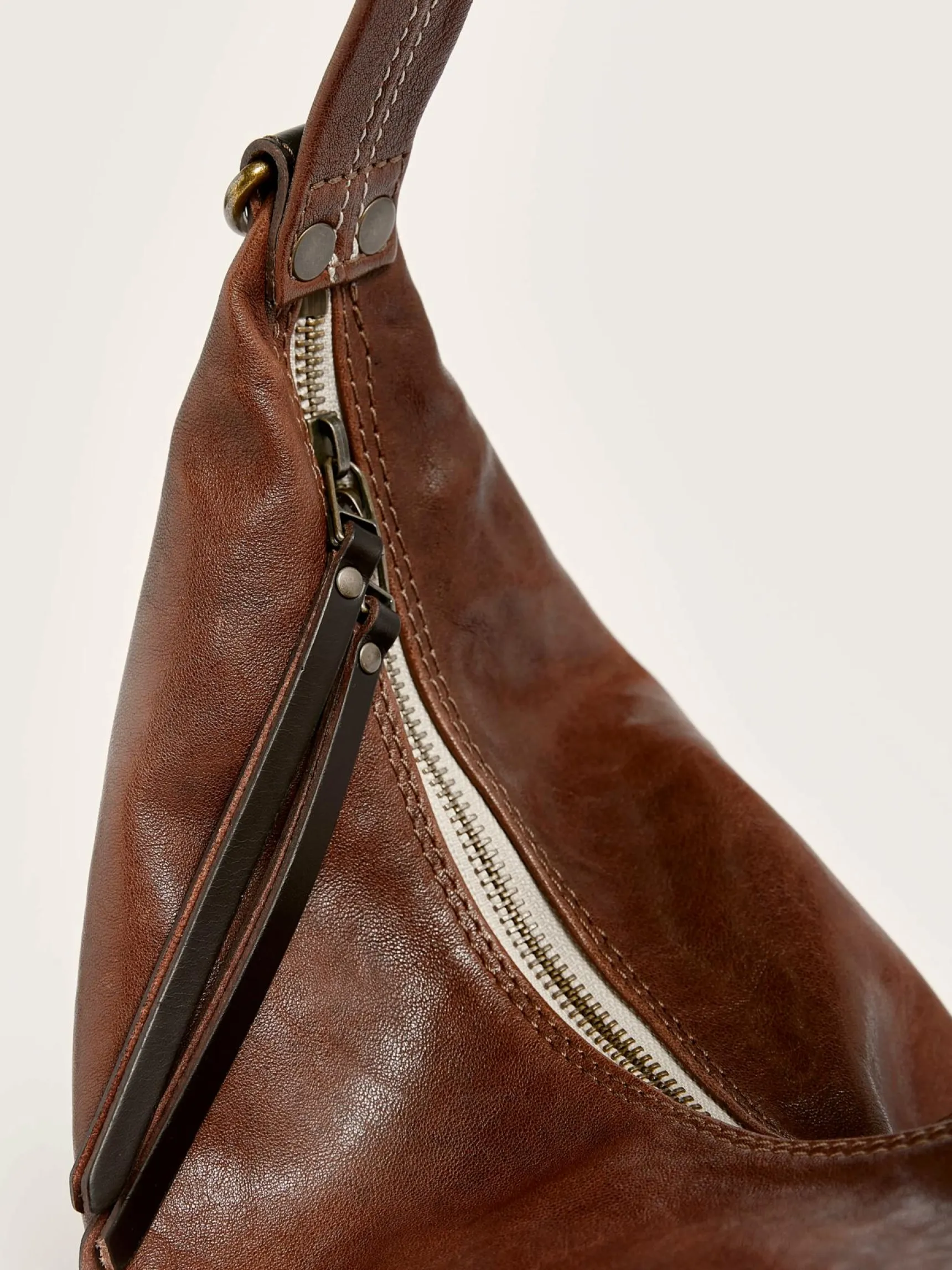 Maanvormige schoudertas van mooi bruin leer.