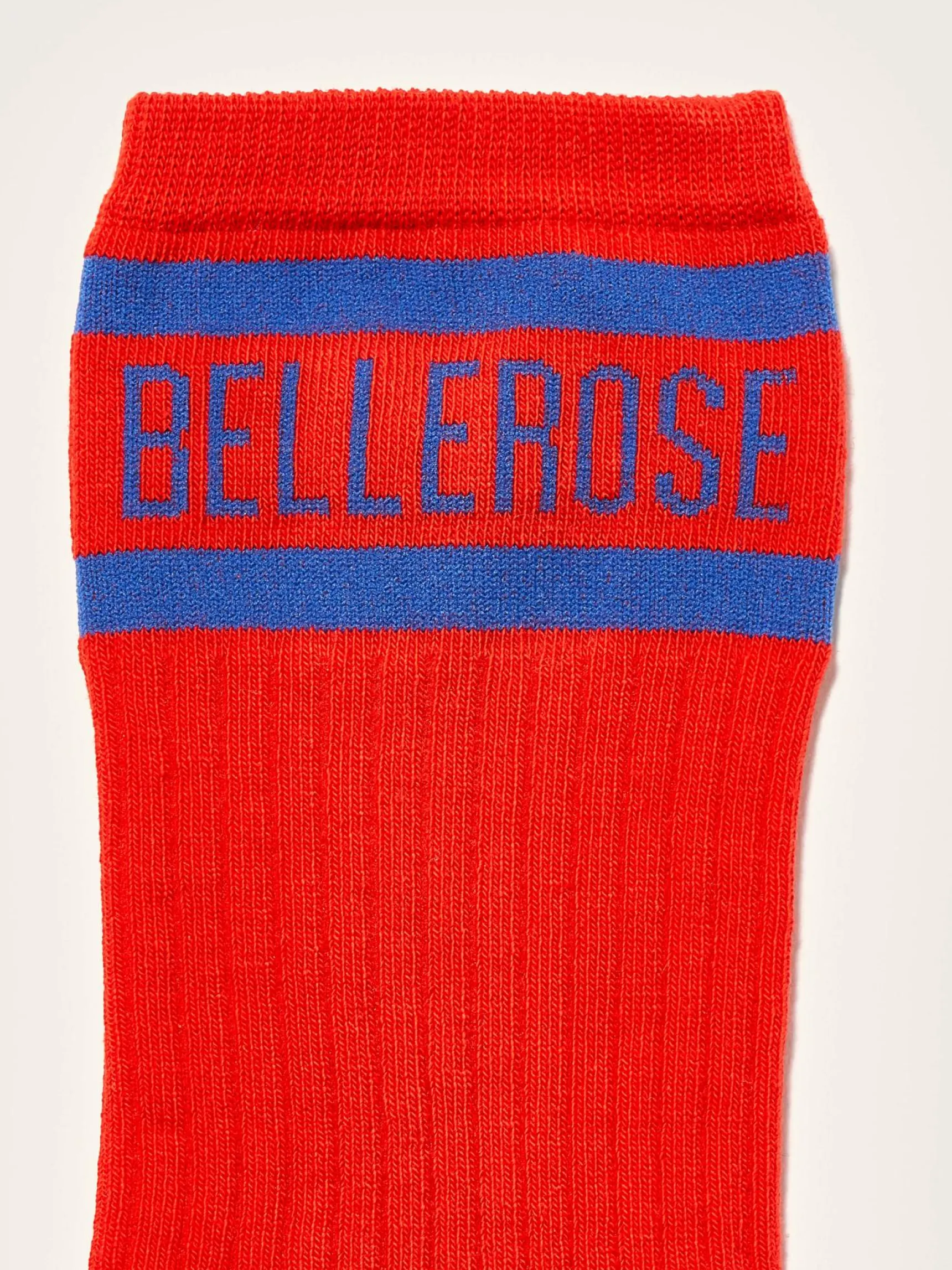 Klassieke, rode sokken met blauw Bellerose-logo ter hoogte van de enkels.