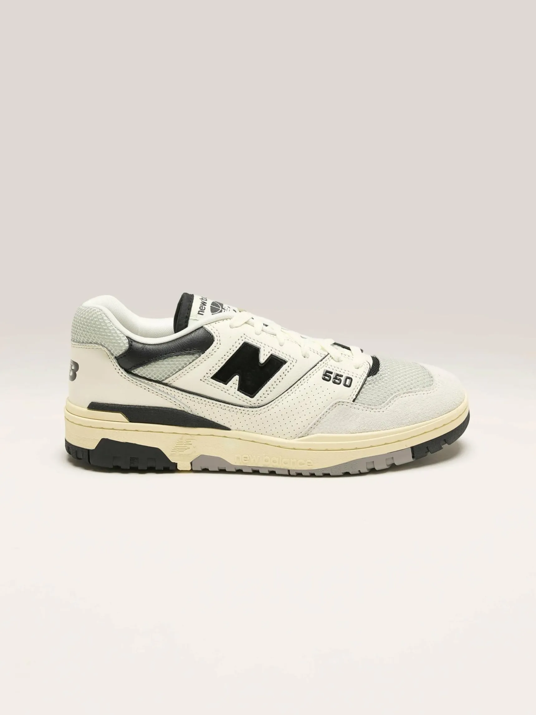 De New Balance 550 low-top alledaagse sneakers hebben een bovenwerk van leder, synthetisch suède, en mesh.
