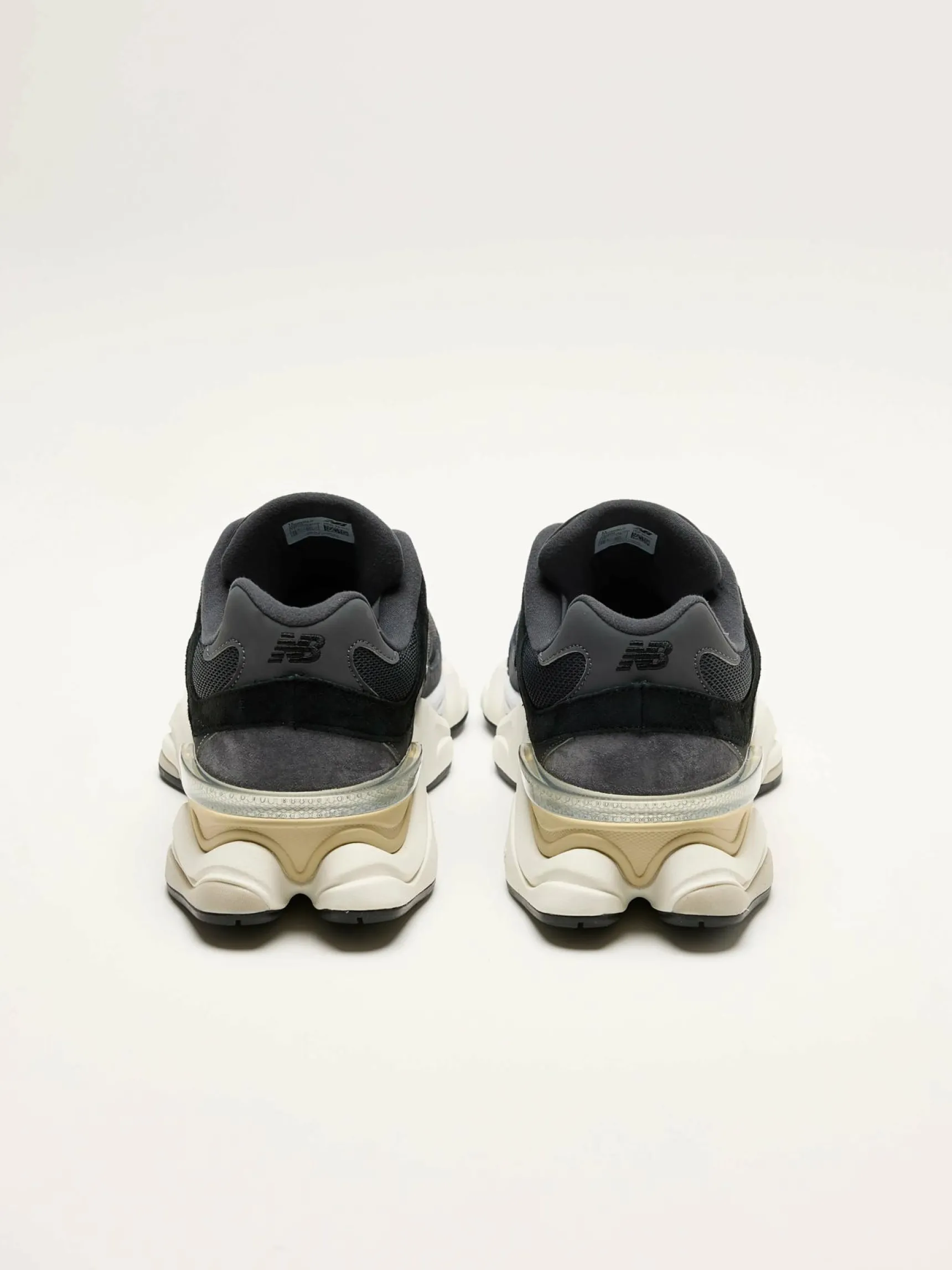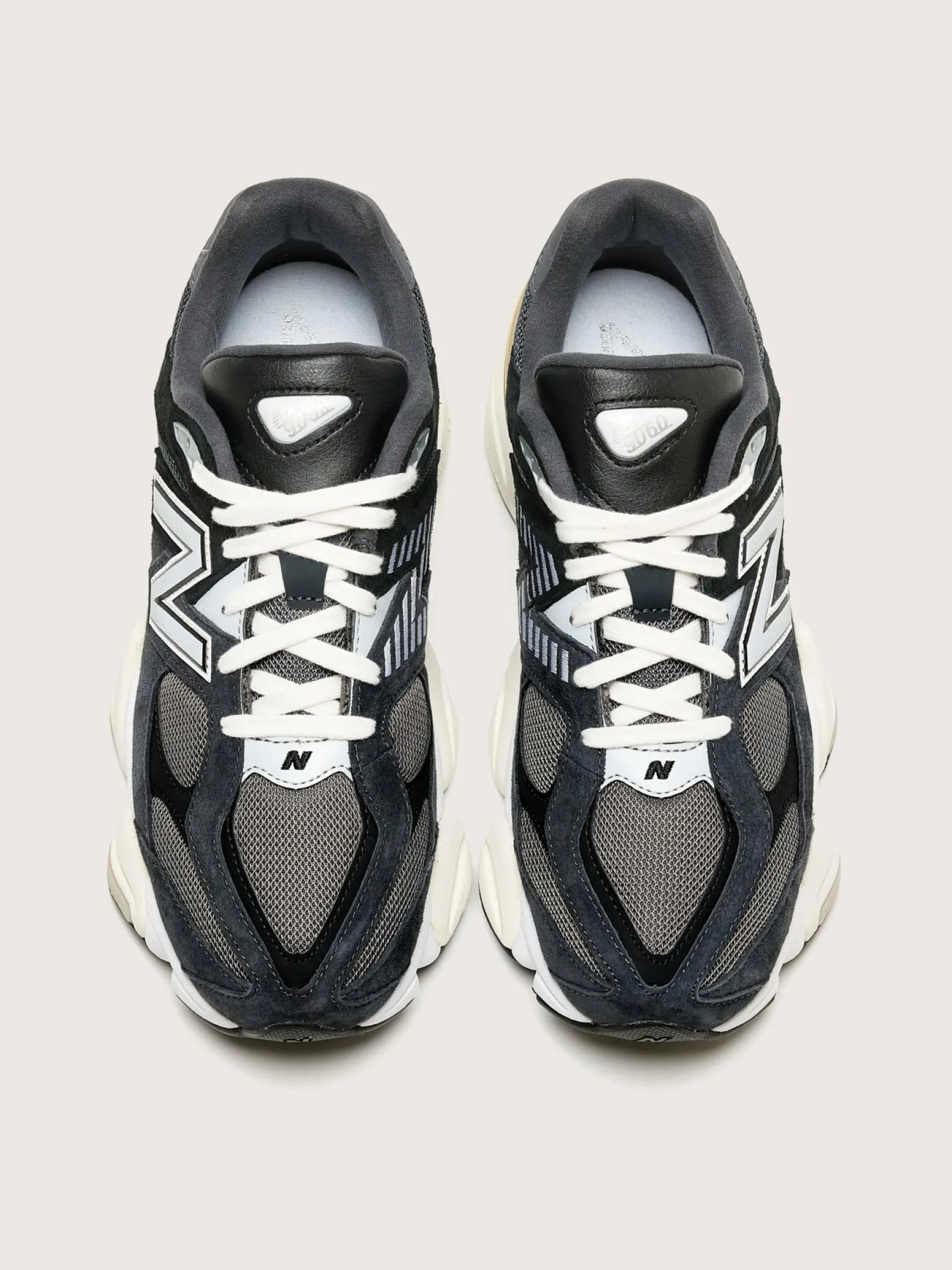 De New Balance 9060 sneakers hebben een technisch bovenwerk van leder, suède en mesh, een dempende middenzool en een buitenzool met een diamanten patroon..