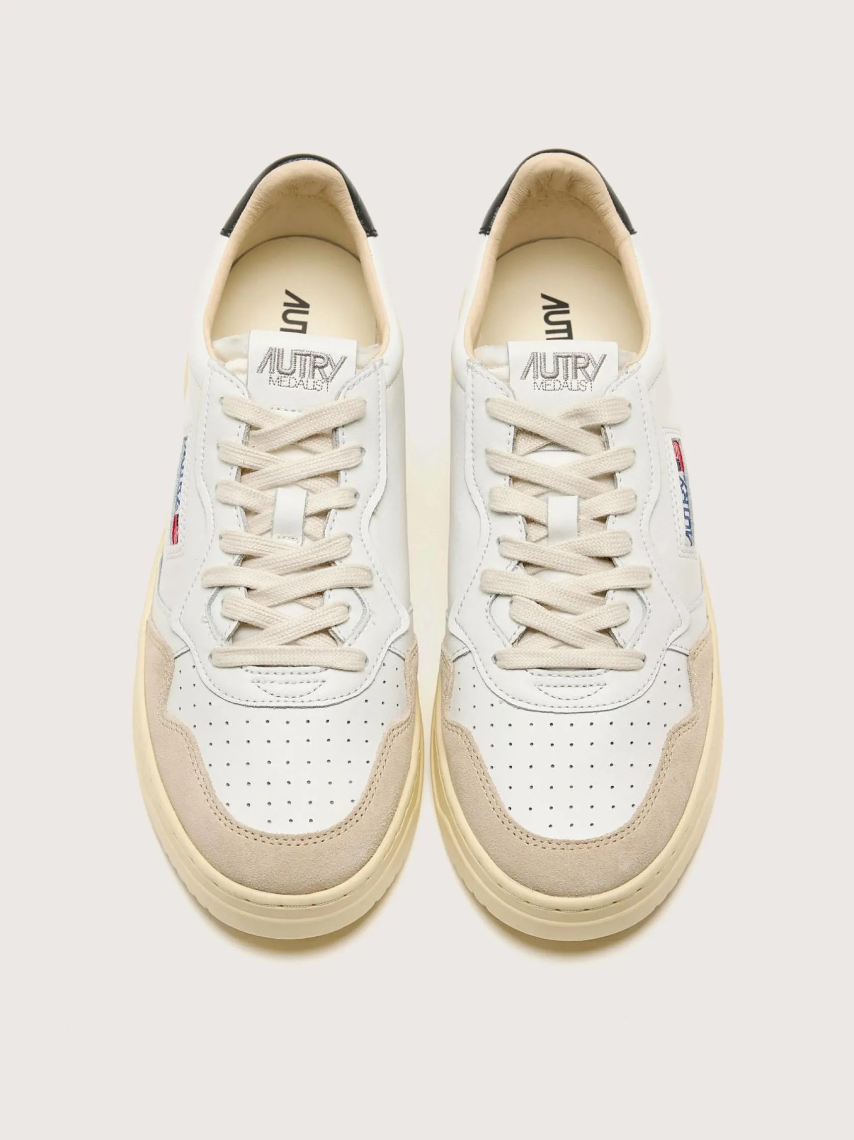 De Autry Medalist Low sneakers hebben een wit soepel lederen bovenwerk met zacht suède panelen, een geperforeerde neus en een zwart lederen hiellipje.