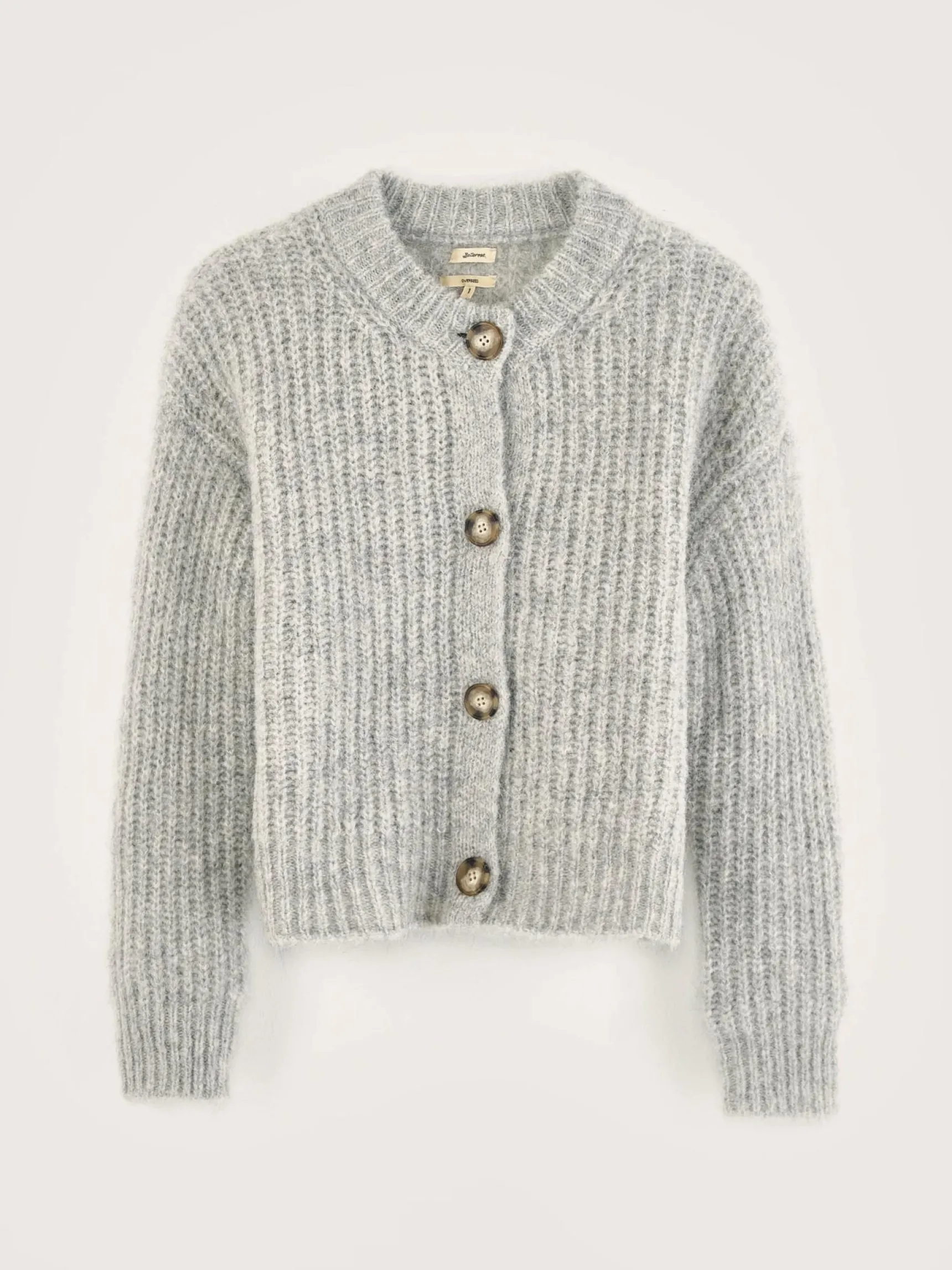 Klassieke, lichtgrijze cardigan van ribtricot.