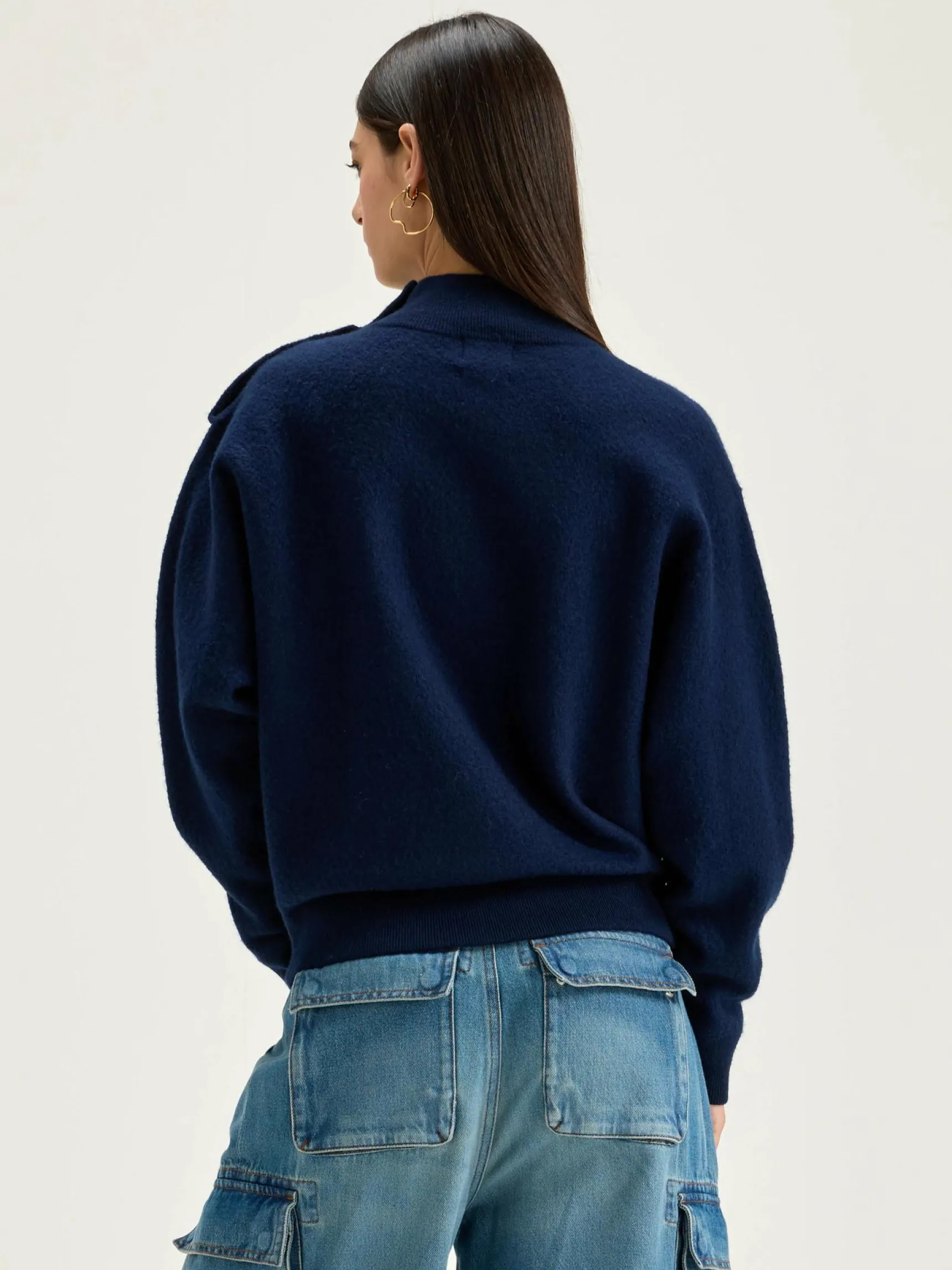 Inktblauwe, oversizede trui met parelmoerknopen op één schouder.