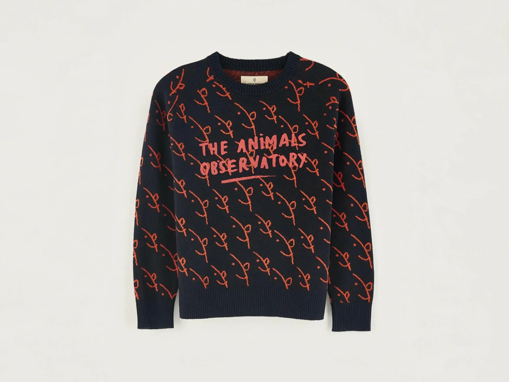 Klassieke sweater met V-hals, van katoen en wol, volledig bedrukt met een jacquardpatroon en een Bellerose x The Animal Observatory-print op de borst en op de rug.