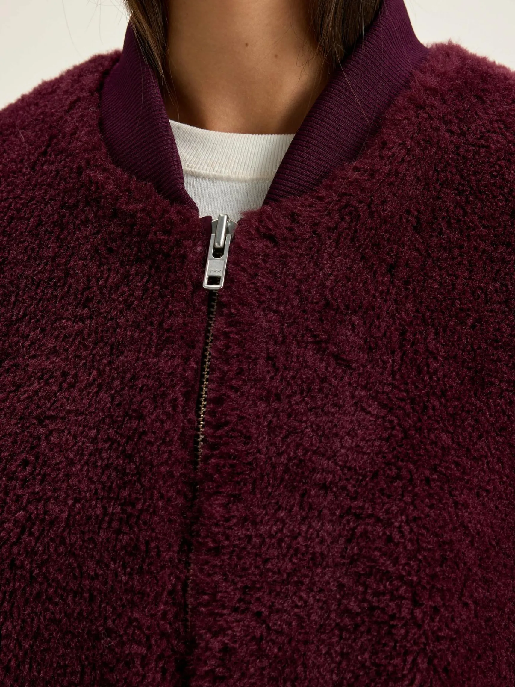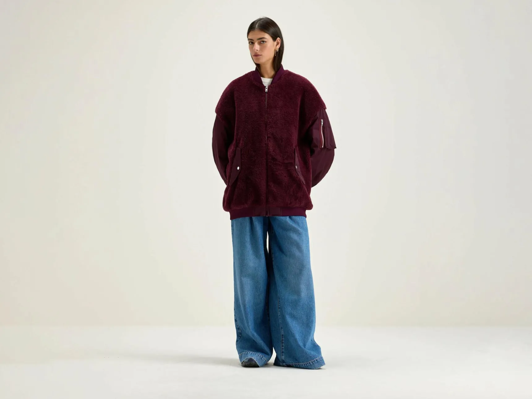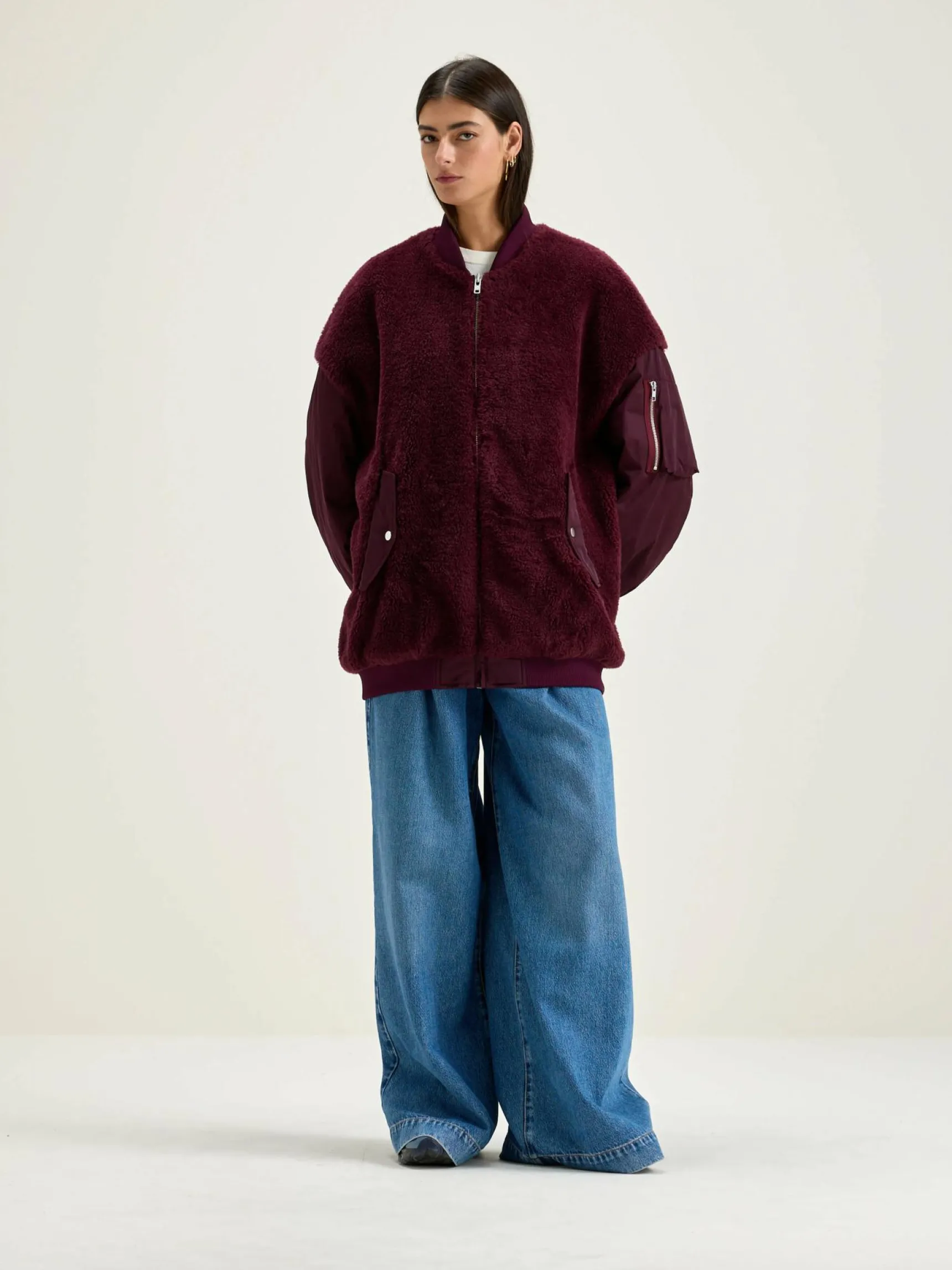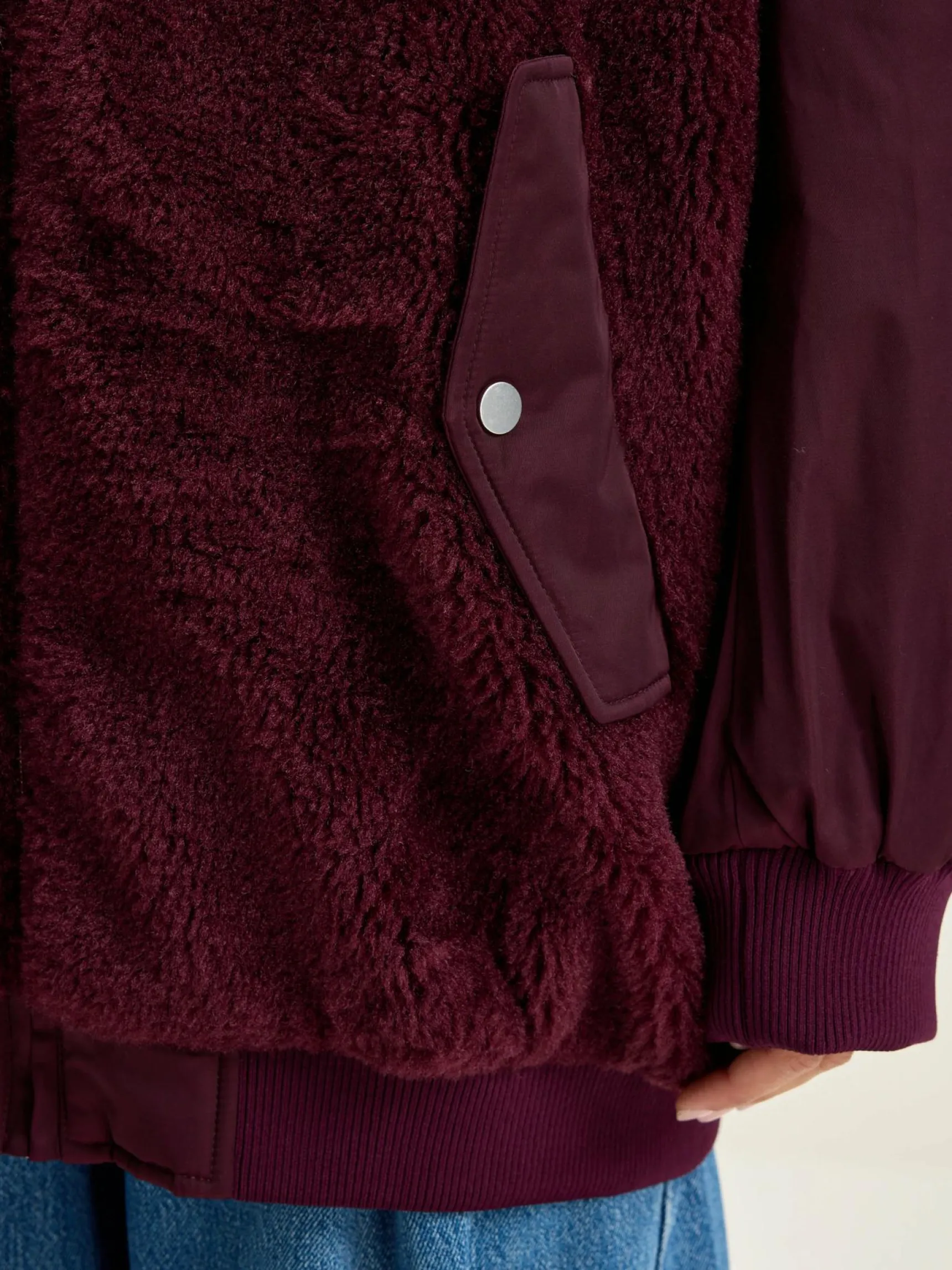 Oversizede, bordeaux bomberjas met een body van nepbont, klepzakken en geribde randen.